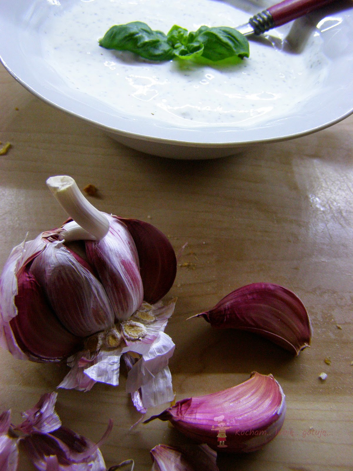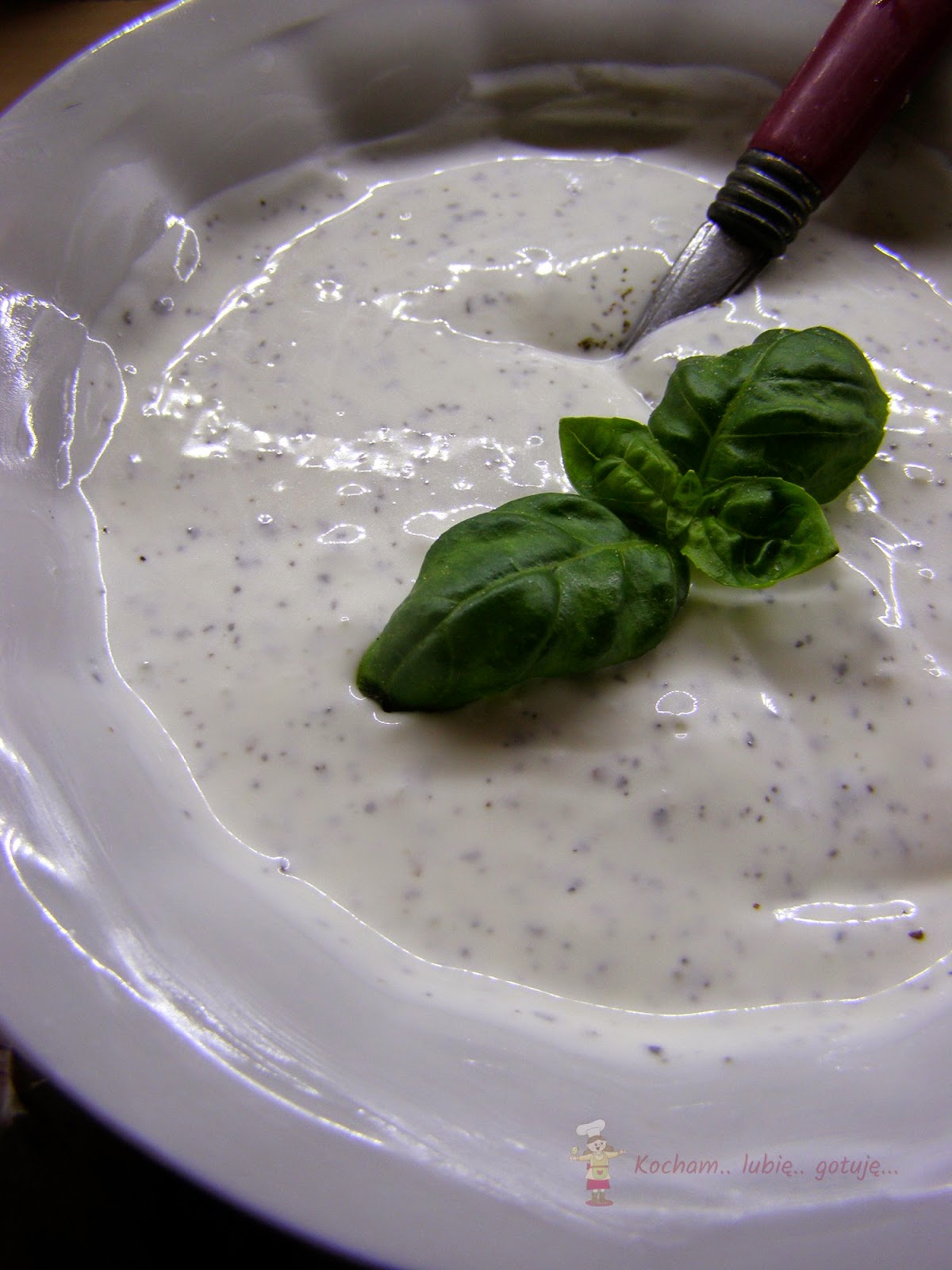 Ja ten sos robię różnie, raz na kwaśnej śmietanie, raz na jogurcie greckim. Jak mam świeży czosnek to przeciskam przez praskę, a jak nie mam daję granulowany. Tak samo z bazylią – raz świeża raz suszona. Nie zawsze też daję majonez. A i tak zawsze jest pyszny. Czy do pizzy, czy do mięs lub wędlin.