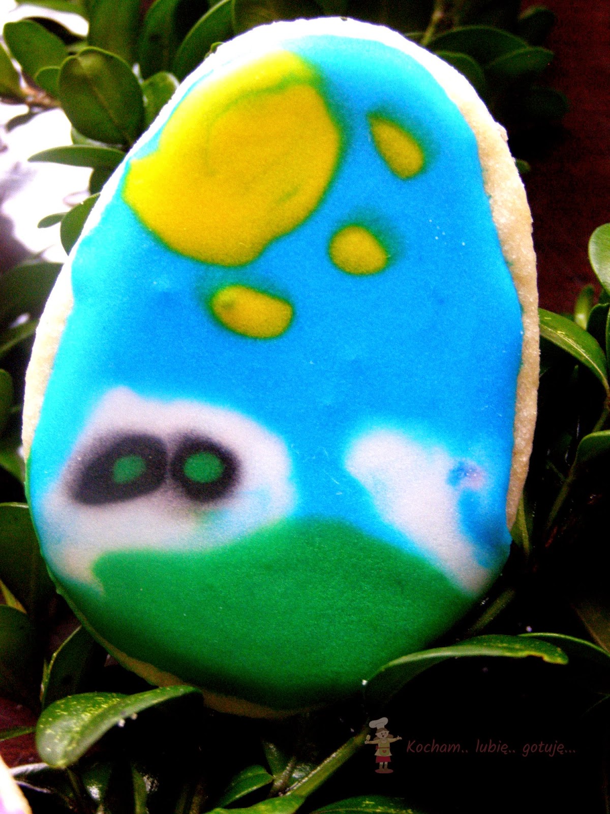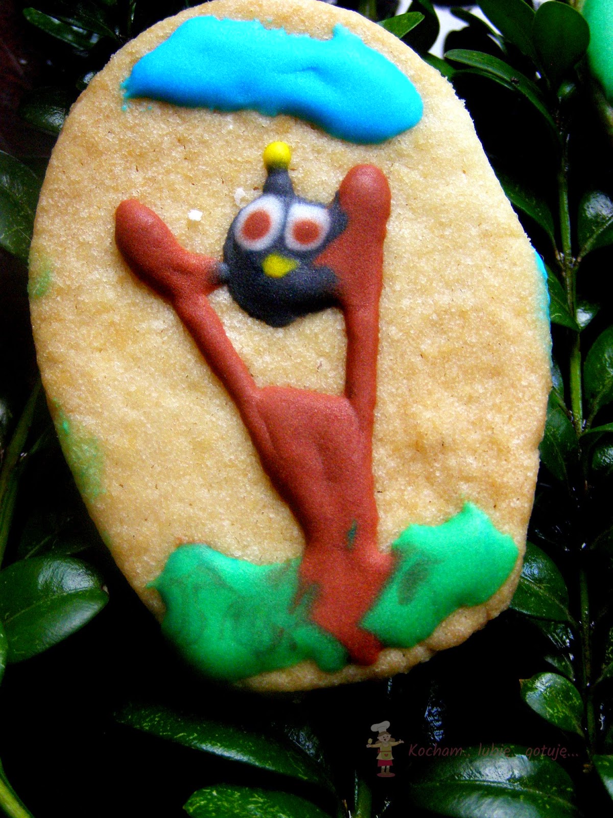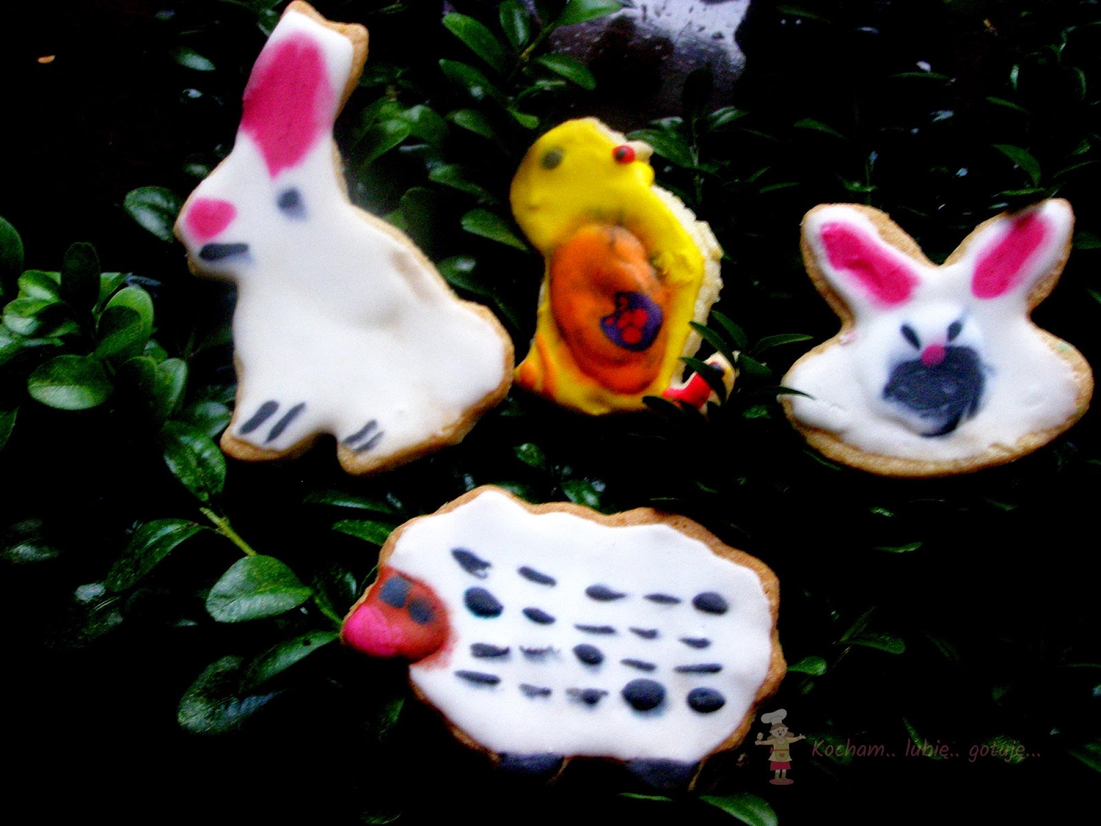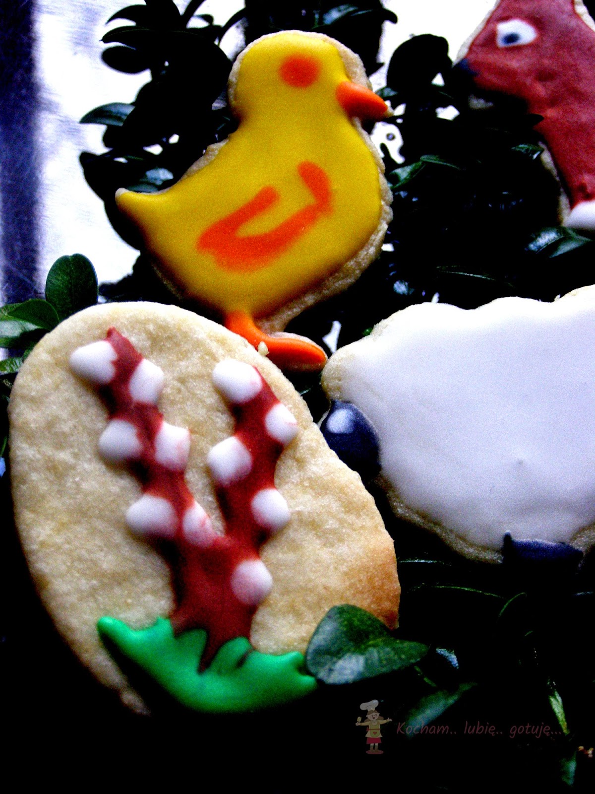 Przygotować lukier królewski: białko utrzeć z cukrem pudrem, sokiem z cytryny na gładką, jednolitą masę. Gdy będzie za rzadki dodać cukru pudru, gdy za gęsty – odrobinkę wody lub soku z cytryny. Rozdzielić do miseczek, dodać barwników spożywczych i dokładnie wymieszać. Kolorowy lukier umieścić w rękawach cukierniczych (tutaj domowe z papieru do pieczenia) i dekorować ciasteczka. Pozostawić do wyschnięcia.
