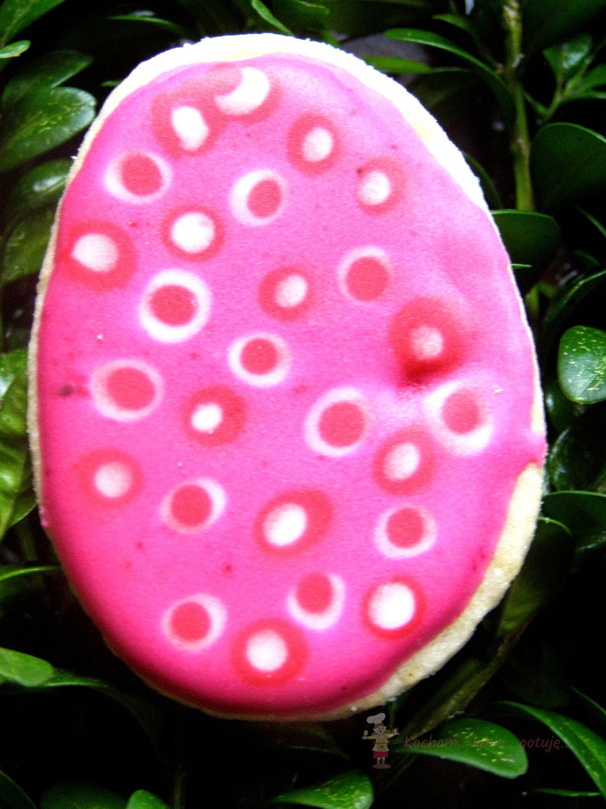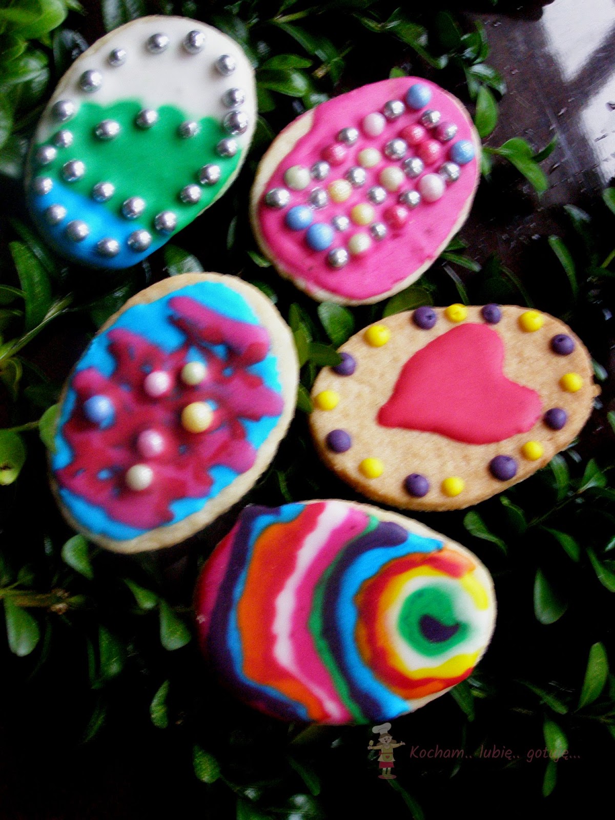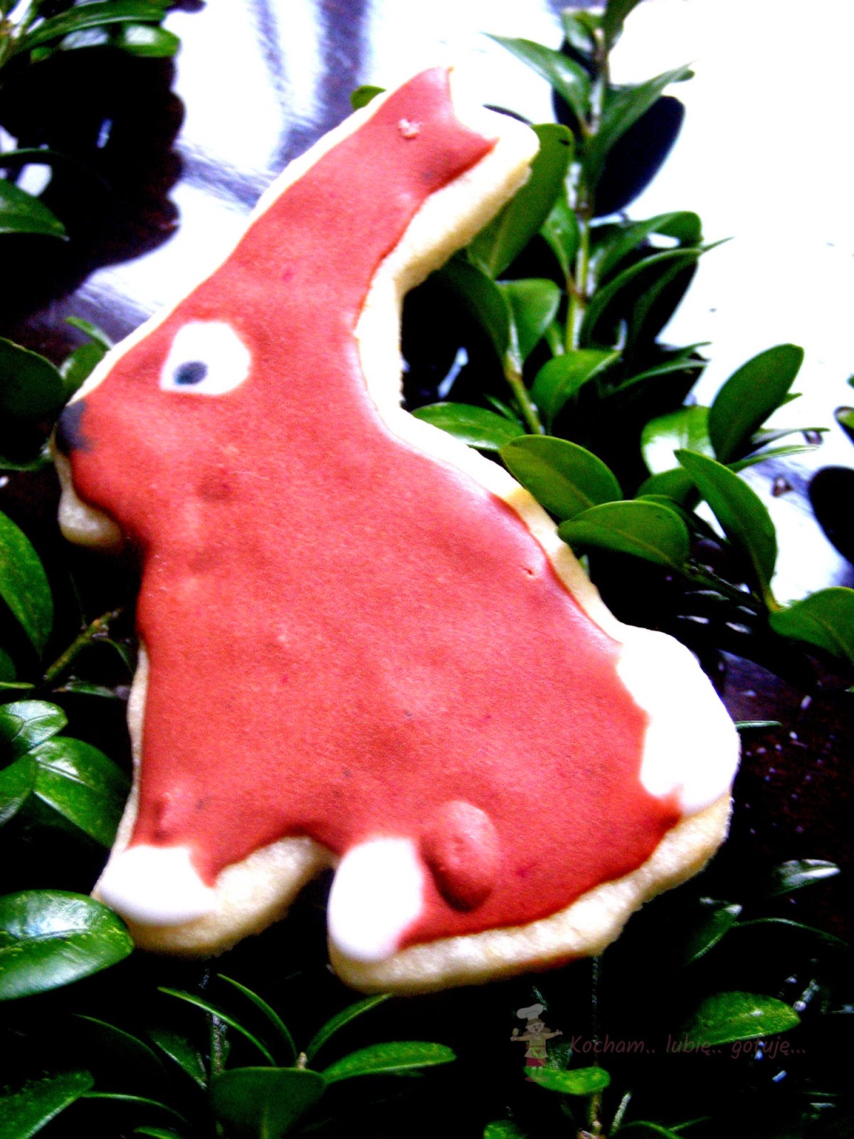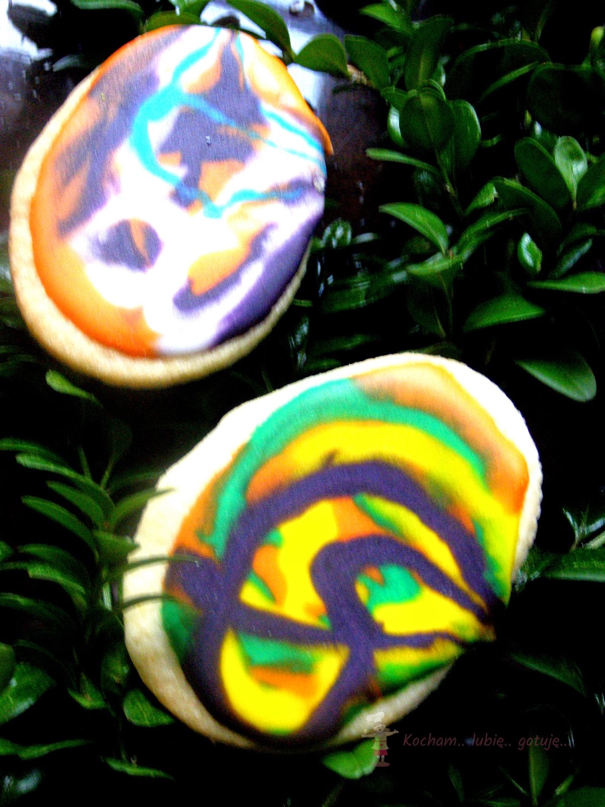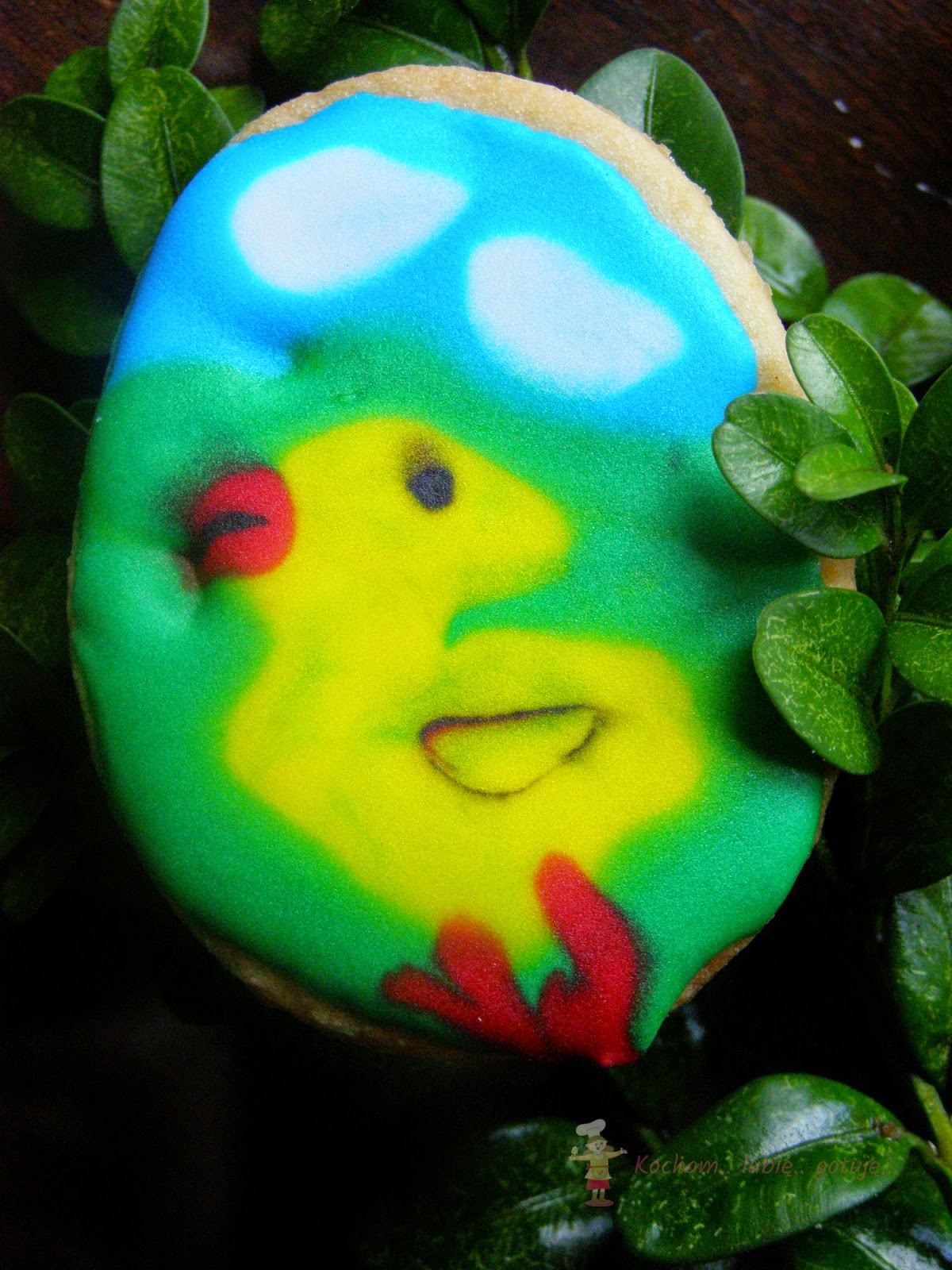 Przygotować lukier królewski: białko utrzeć z cukrem pudrem, sokiem z cytryny na gładką, jednolitą masę. Gdy będzie za rzadki dodać cukru pudru, gdy za gęsty – odrobinkę wody lub soku z cytryny. Rozdzielić do miseczek, dodać barwników spożywczych i dokładnie wymieszać. Kolorowy lukier umieścić w rękawach cukierniczych (tutaj domowe z papieru do pieczenia) i dekorować ciasteczka. Pozostawić do wyschnięcia.