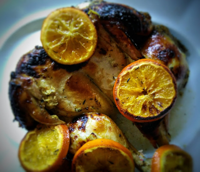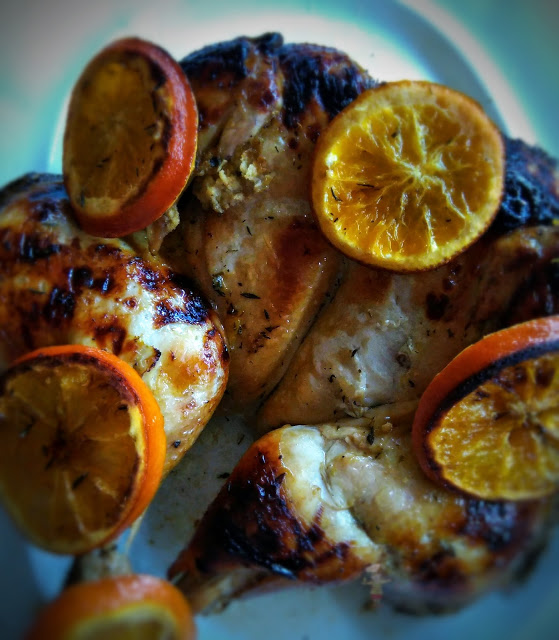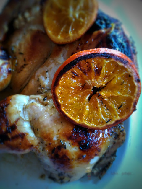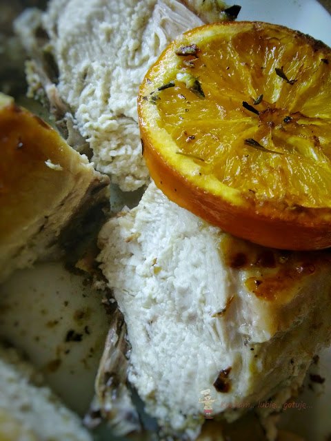 Piekarnik nagrzać do temperatury 1800C. Kurczaka wraz z całą marynatą umieścić w naczyniu żaroodpornym lub na blasze, tak aby kurczak leżał płasko, najpierw skórką do dołu. Piec 60 min. Ja piekłam w naczyniu żaroodpornym pod przykryciem. Po tym czasie kurczaka obrócić skórką do góry, obłożyć plastrami pomarańczy. Jeśli mamy, dołożyć na wierzch gałązkę świeżego tymianku i piec kolejne 50 – 60 min, najlepiej już bez pokrywy – wtedy sos ładnie się zredukuje.