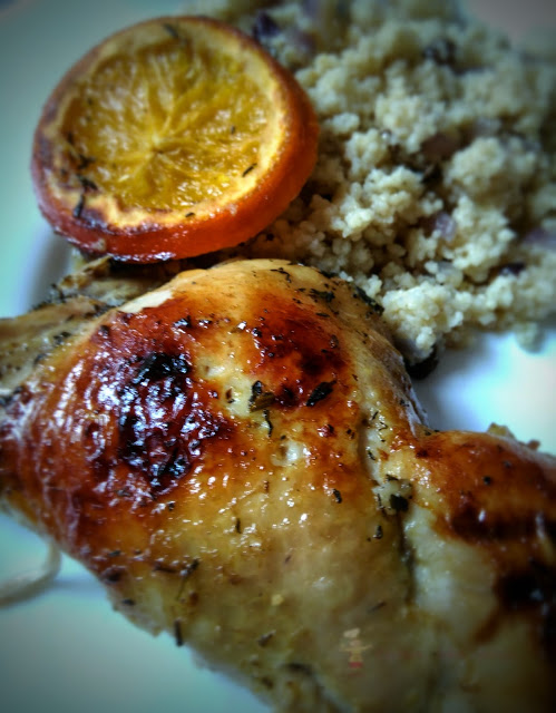 W pieczonym kurczaku najbardziej lubimy piękną, chrupiącą skórkę. Taką skórkę możemy uzyskać dzięki patentowi na pieczenie kurczaka tzw „płaskiego” (flat roasted chicken), wykonując specyficzne cięcie „flat cut”. Sposób ten kiedyś widziałam w programie Mad hungry, przedstawiony przez Lucindę Scalę Quinn. Robiła ona kiedyś kurczaka w azjatyckim stylu, w aromatycznej pomarańczowej marynacie. Kurczaka kładła na rozgrzaną żeliwną patelnię i piekła w piekarniku. Ja upiekłam kurczaka w troszkę inny sposób, pozwalając aby kurczak piekł się w marynacie, chłonąc jej wszystkie smaki, oprócz tego powstaje niezwykle aromatyczny sos. Przydał mi się do polania kaszy kuskus, którą podałam do tego kurczaka. W takiej marynacie można zrobić nóżki kurczaka, czy też same piersi lub skrzydełka. Przepis na marynatę pochodzi z ulotki reklamowej sieci sklepów Biedronka – aż się cały czas dziwię, jakie świetne przepisy tam publikują, czytajmy dokładnie ulotki!