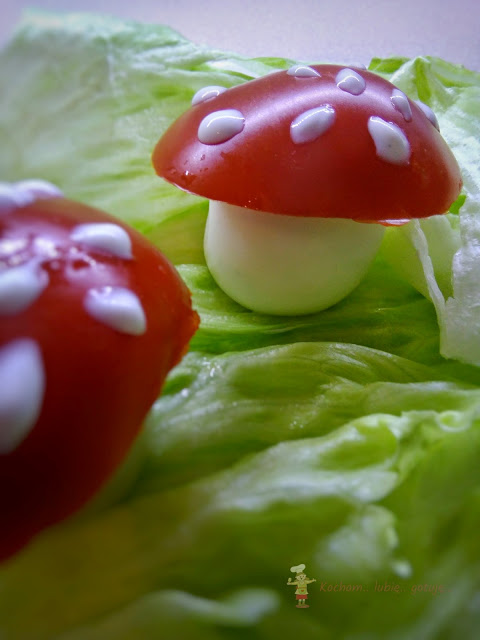 Z ugotowanych jajek na twardo delikatnie obciąć obydwa końce, tak aby jajko stabilnie stało. Na wierzch położyć odciętą końcówkę pomidora – będzie to kapelusz. Majonezem, serkiem lub jogurtem „namalować” białe kropki na kapeluszu.