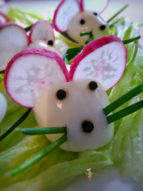 Jajka ugotowane na twardo przeciąć wzdłuż. Położyć połówki na talerzu lub jak u nas na liściach sałaty. Rzodkiewkę pokroić w plastry – będą to uszy. Szczypior pociąć na mniejsze kawałki – będą to wąsy i większe – będzie to ogon. Rzodkiewkę i szczypior wetknąć na miejsce uszu, wąsów i ogona. Z pieprzu zrobić oczy i nos.