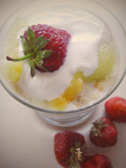 Lubię połączenie melona z truskawkami i na zdrowe śniadanie moja propozycja to owsianka właśnie z melonem, truskawkami i jogurtem naturalnym. Pysznie i zdrowo :) Z podanych składników wyszła mi porcja około 300 ml. Polecam!