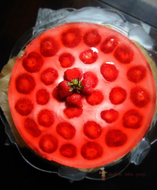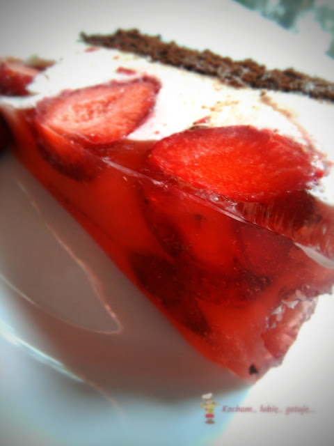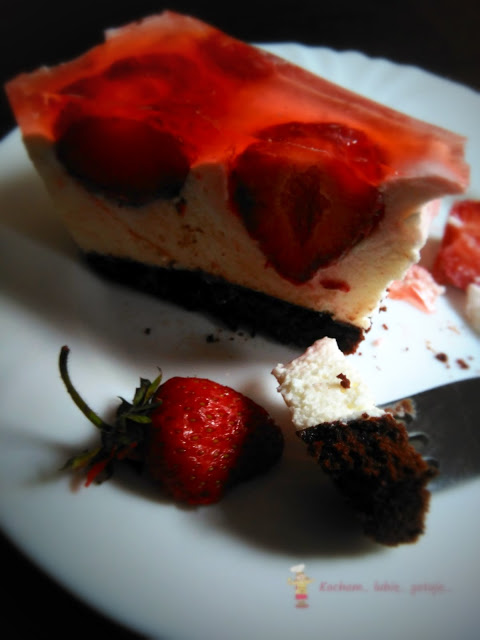 Deser z gatunku tych lżejszych, biała masa zrobiona na bazie jogurtu greckiego z dodatkiem kremówki, która sprawia, że sernik jest lekki i puszysty. Zatopione w masie truskawki i galaretka wieńczą górę, a całość jest na mocno kakaowym biszkopcie, który troszkę niweluje słodycz masy. Biszkopt oczywiście rzucany :) Dla osób zapracowanych, nie mających czasu na pieczenie domowego biszkoptu polecam użycie kupnych biszkopcików i wyłożenie nimi dna blachy. Mi bardzo smakowało :)