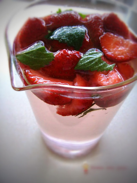 Truskawki umyć, odszypułkować i pokroić na połówki. Umieścić w dzbanku. Miętę umyć i porwać na mniejsze części, dołożyć do dzbanka z truskawkami. Całość zalać wodą mineralną, dodać sok z cytryny i zamieszać.