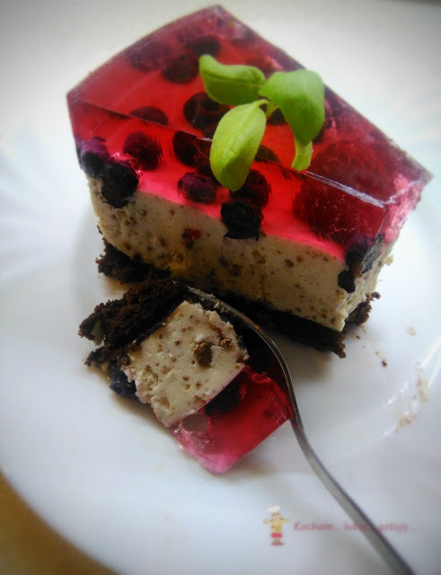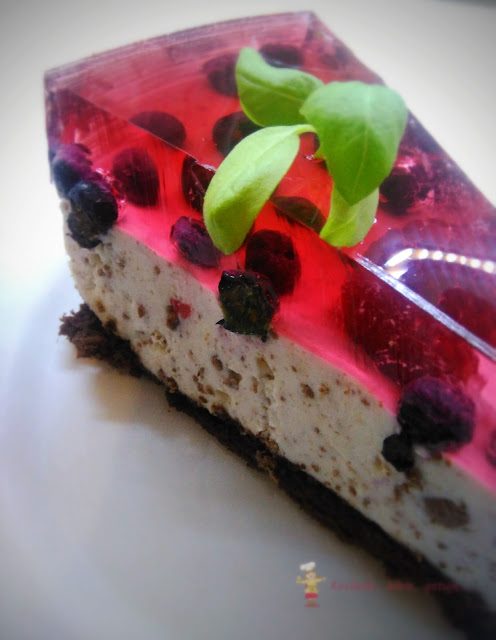 Moje Wypieki. Tym razem wersja straciatella z borówkami, malinami i galaretką z owoców leśnych. Przepis mało skomplikowany a jakże pyszny. Nie za bardzo lubię spody ciasteczkowe, więc upiekłam biszkopt kakaowy. Dodałam też mniej kakao do biszkoptowego spodu aniżeli w