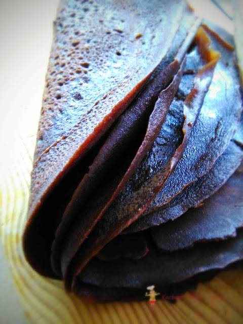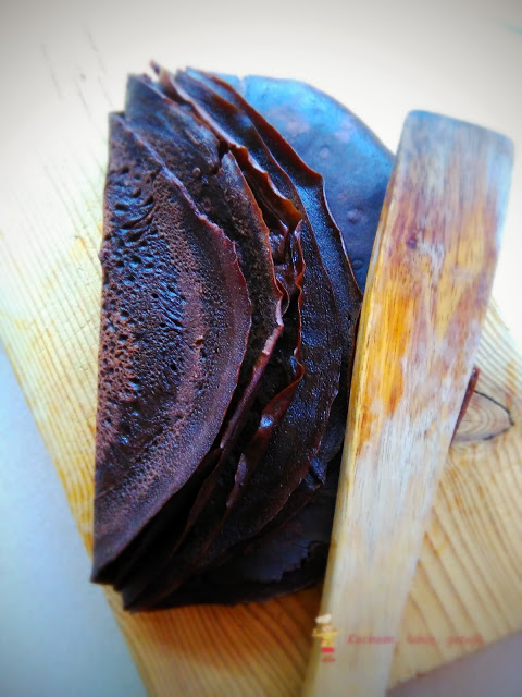 Z powodzeniem wykorzystuję zapasy mąki kukurydzianej. Mam na nią wiele pomysłów, a jednym z nich są czekoladowe naleśniki. Przepis na zwykłe, żółciutkie naleśniki znalazłam na stronie Moje Wypieki. Ja natomiast mąkę pszenną zamieniłam na kakao i miałyśmy z córcią wersję czekoladową. Naleśniki z mąką kukurydzianą są specyficzne, nie takie do jakich się przyzwyczailiśmy – nie mniej jednak wcale nie gorsze. Świeżutkie zdjęte z patelni mogą się łamać, jednak wystarczy dać im chwilę po usmażeniu i już można je zwijać w rulony lub koperty. Naleśniki podałam na dwa sposoby, jedne z dżemem a drugie z kremowym twarożkiem i owocami.