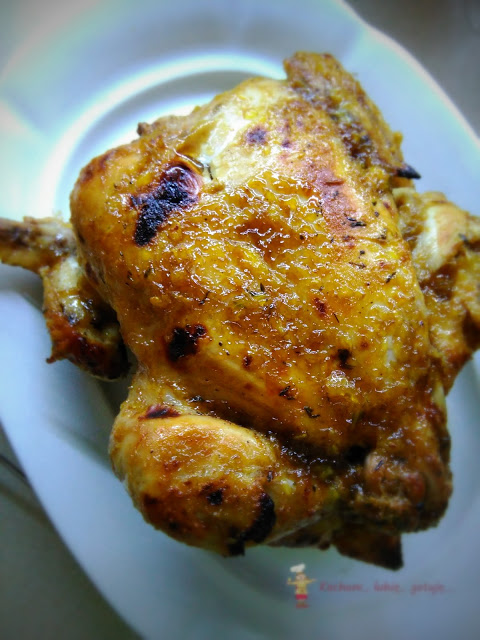 Po tym czasie wszystkie składniki glazury umieścić w miseczce i wymieszać. Kurczaka wyjąć z lodówki, ułożyć w naczyniu żaroodpornym wraz z marynatą. Kurczaka ułożyć piersią do dołu. Górę kurczaka posmarować częścią glazury, przykryć pokrywą i wstawić do piekarnika nagrzanego do 200oC. Piec 1 godz i 15 min pod pokrywą, następnie pokrywę zdjąć i piekarnik ustawić na funkcję grzałki górnej. Gdy kurczak się zarumieni obrócić go piersią do góry (kładę na wcześniej zdjętą pokrywę a marynatę zlewam do rondelka), posmarować dokładnie kurczaka resztą glazury i zapiekać aż do zrumienienia skórki, około 15 min.