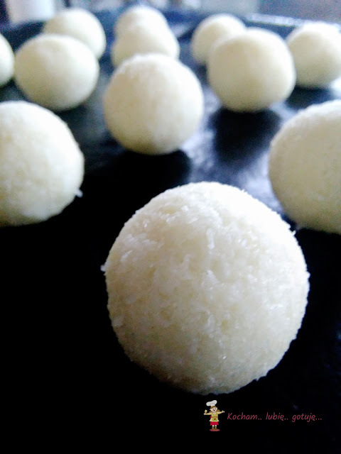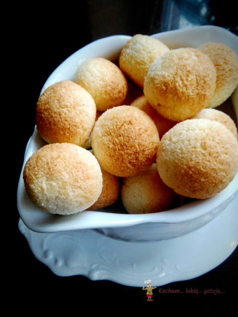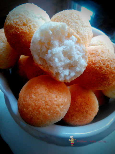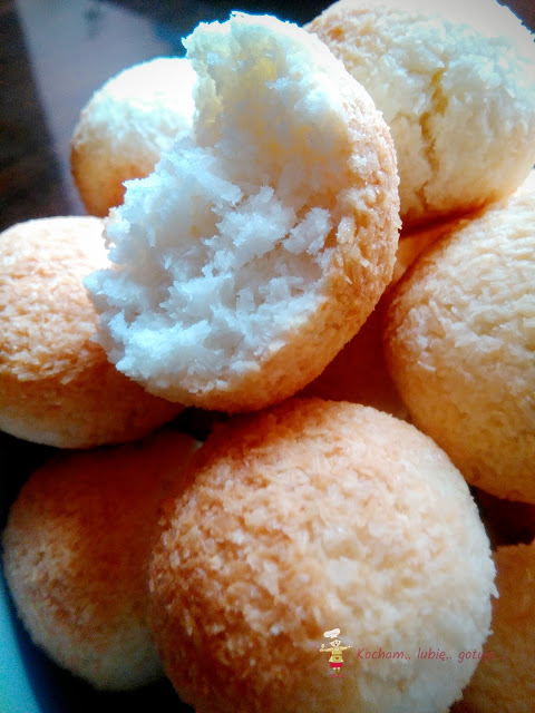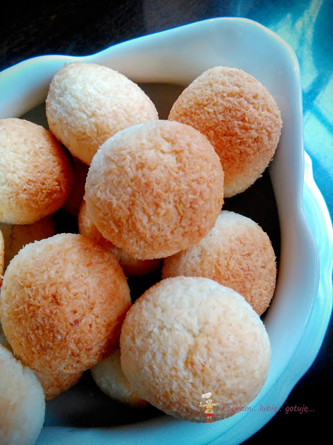Po wypieku drożdżowych serc zostało mi kilka białek. Zazwyczaj białka mrożę lub robię bezy, lecz tym razem upiekłyśmy z córcią kokosanki. Bardzo proste i szybkie, na samych białkach z dodatkiem odrobiny mąki. Wiórki już same w sobie zawierają tłuszcz, więc nie dodajemy tutaj już żadnego innego tłuszczu. Z masy fantastycznie robi się zgrabne kuleczki, które zachowują kształt. Z wierzchu są pięknie upieczone i chrupiące, w środku pozostają miękkie. Wykorzystałam przepis z książki „Kuchnia Polska na wszystkie okazje” Izabeli Jesiołowskiej i Hanny Szymanderskiej.