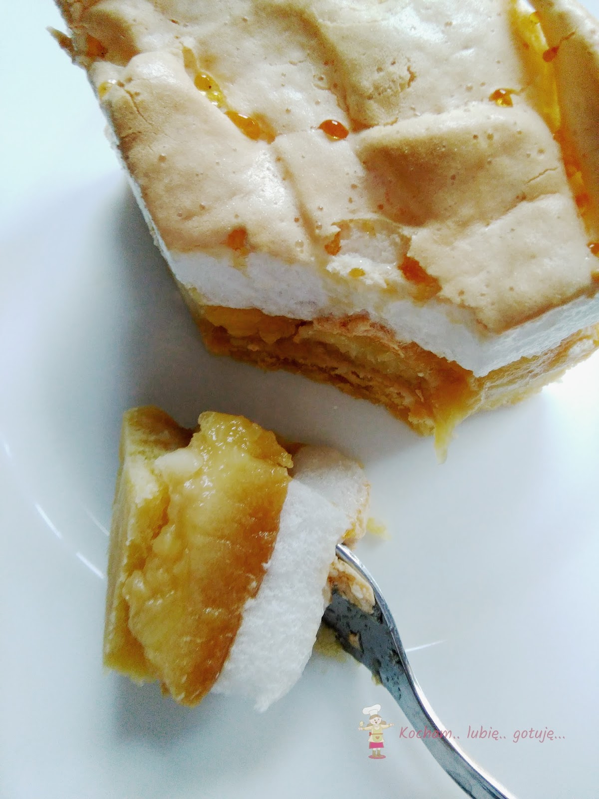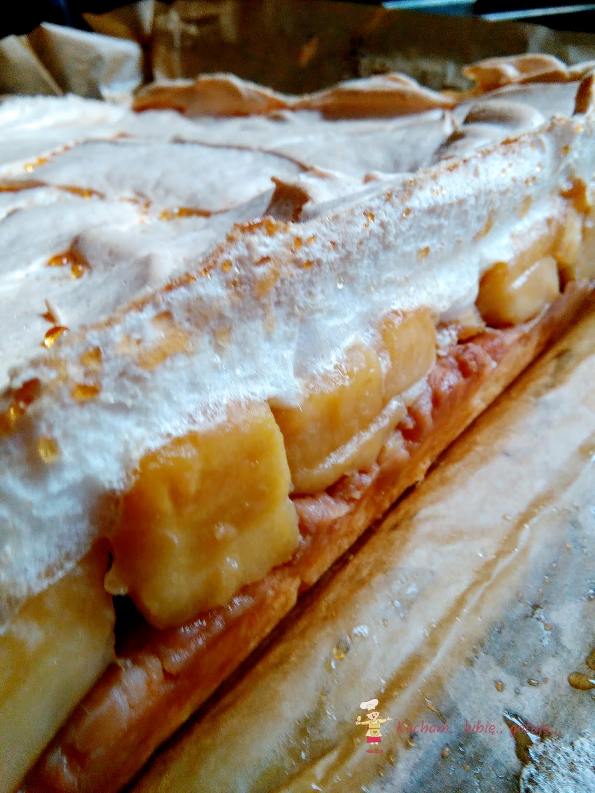 Taką szarlotkę miałam okazję jeść oraz przygotować po raz pierwszy, a szkoda, ponieważ jest bardzo pyszna. Kruche ciasto bez proszku do pieczenia (!) z dodatkiem skórki cytryny, karmelizowane jabłka i zwieńczenie słodziutką bezą, na której pojawiły się piękne, bursztynowe kropelki rosy. Przepis ze zbiorów Jesiołowskiej i Szymanderskiej, książki, która ostatnio leży u mnie na blacie cały czas. Pominęłam tylko cynamon do jabłek – do bezy wolałam czysty smak jabłek. Polecam bardzo!
