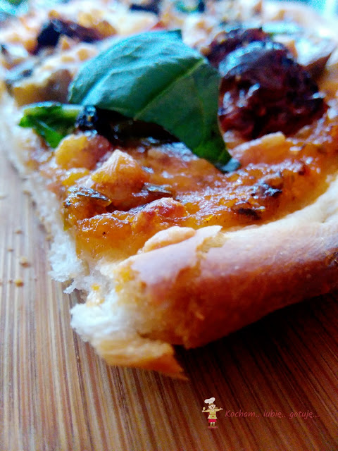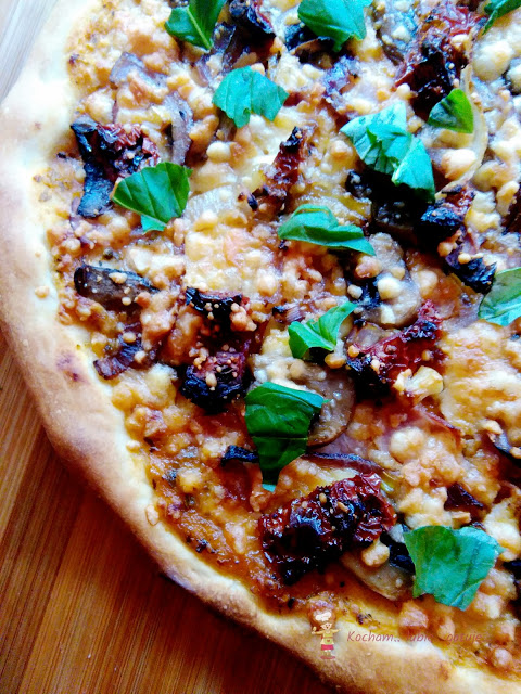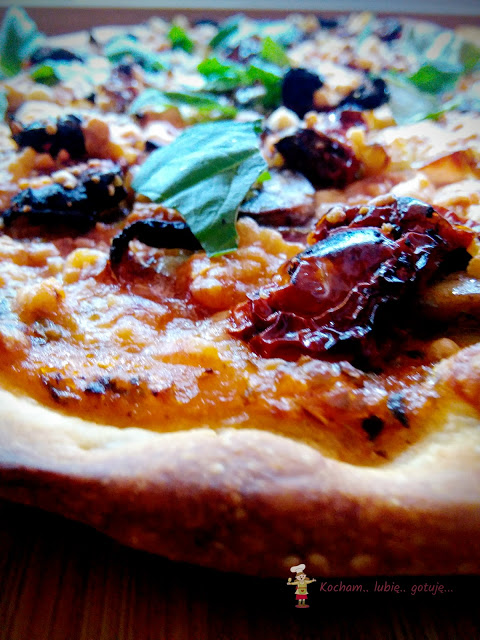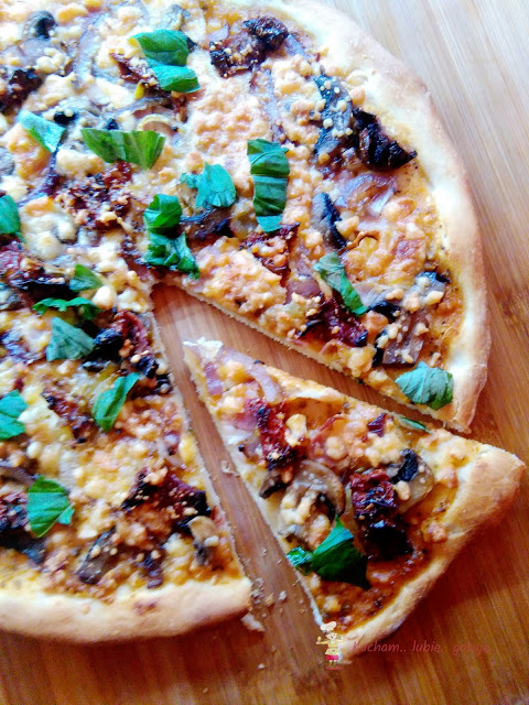 Do zbiorów z przepisami na pizzę dołącza wersja z wędzonym boczkiem, suszonymi pomidorami, przysmażoną cebulką i pieczarkami. Spód z tego przepisu wychodzi cienki i chrupiący, ale jak zawsze można użyć dowolnego, ulubionego przepisu na ciasto. Kropeczką nad „i” był oczywiście sos czosnkowy. Pyszna była ta pizza!