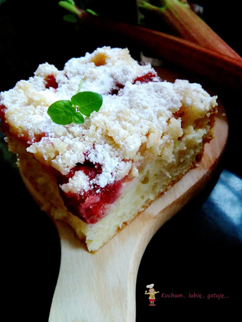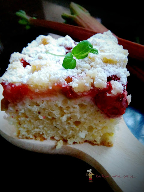 Ciasto wyłożyć na blachę wyłożoną papierem do pieczenia (25 cm x 30 cm), rozłożyć rabarbar i truskawki (mrożonych nie rozmrażałam), na wierzch wyłożyć kruszonkę.