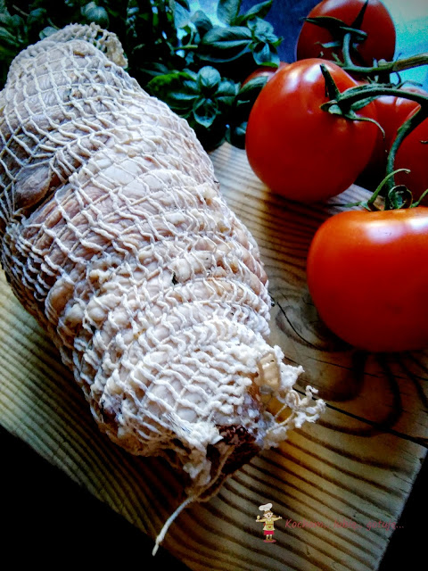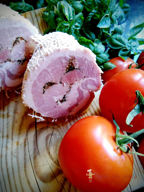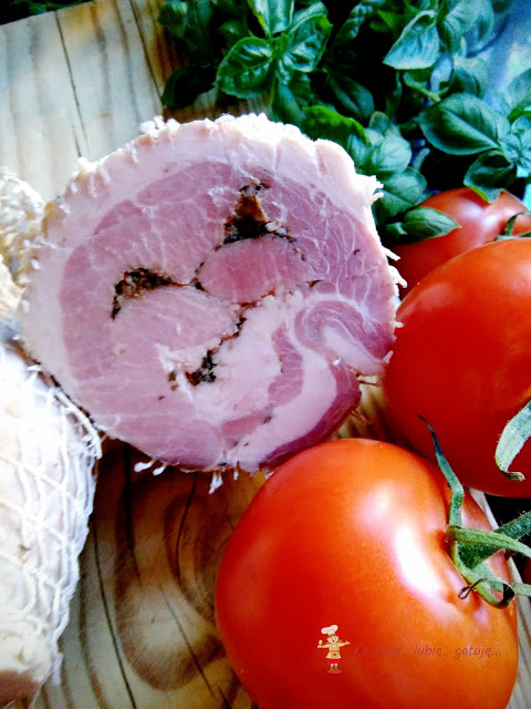 Teraz, kiedy mamy świeże warzywa to wędliny u mnie schodzą na dalszy plan, mogę się bez nich obejść. Jednak dla mojego męża zawsze w lodówce jakaś wędlina być musi. Robienie domowych wędlin pochłonęło mnie całkowicie i zamiast powielać przepisy powolutku stawiam samodzielne kroki eksperymentując z nowymi smakami, opierając się na starych recepturach i poznanych już zasadach. W ten oto sposób przygotowałam roladę z łopatki wieprzowej na bazie wcześniejszego przepisu na