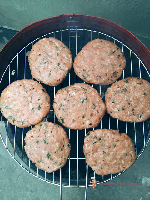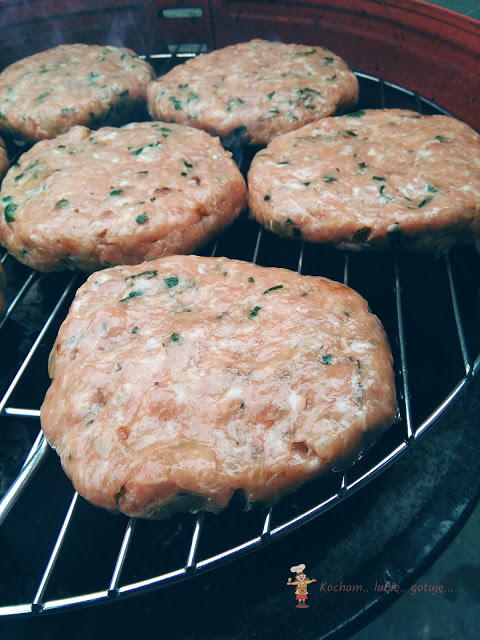Formować burgery, u mnie 200 g na porcję i odkładać na tacę posmarowaną olejem. Tacę przykryć folią i schować do lodówki na około 2-3 h, aby mięso nabrało smaku i nie rozpadało się podczas grillowania. Przed grillowaniem delikatnie posmarować olejem.