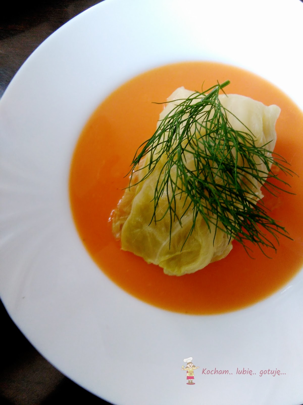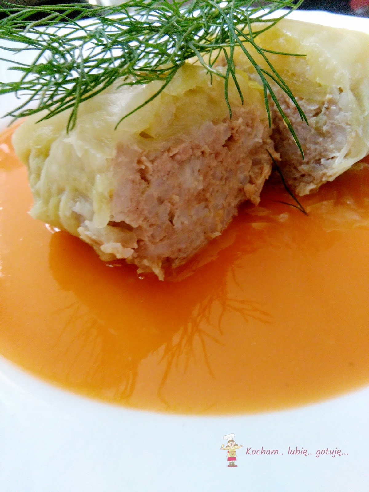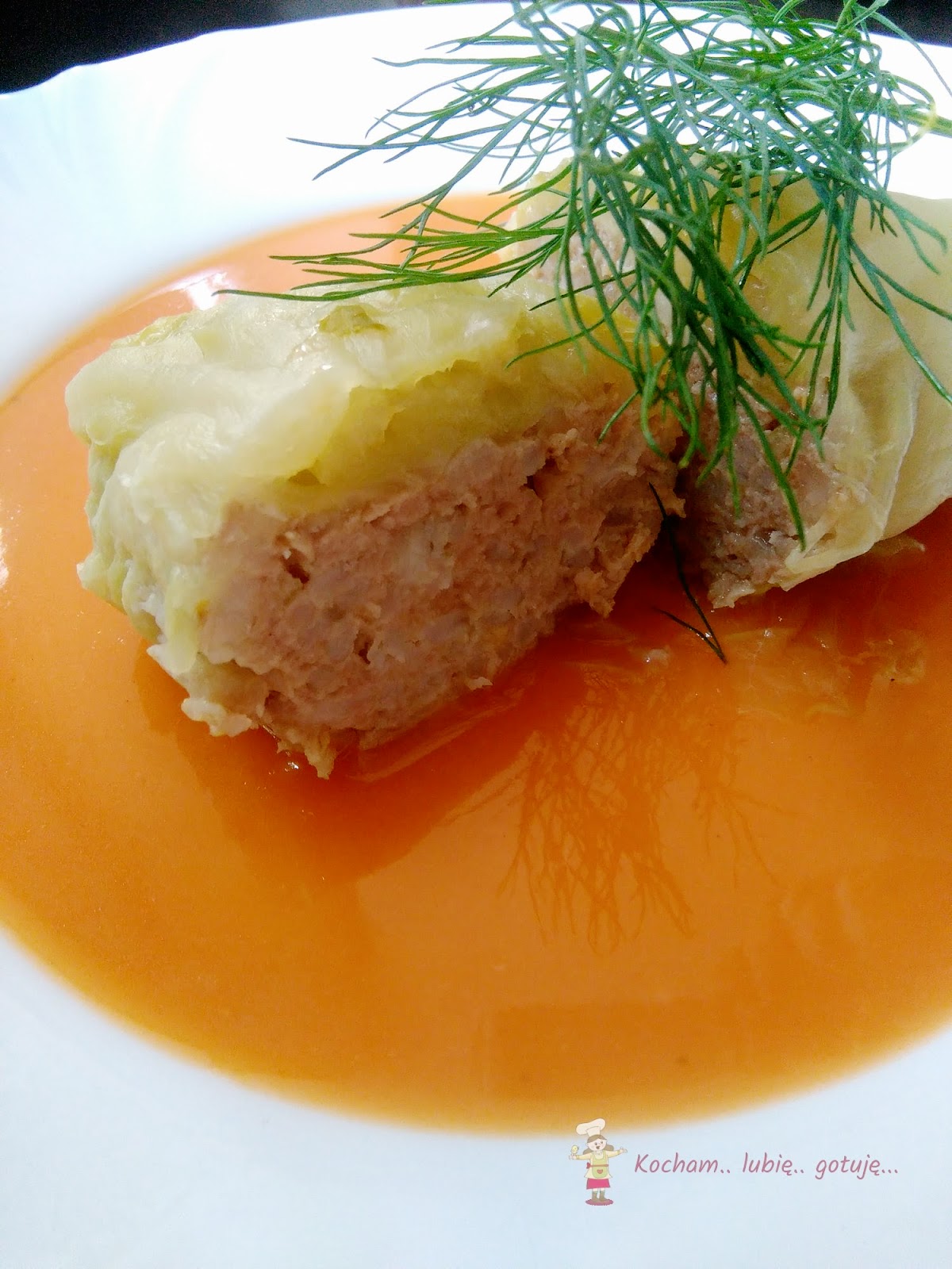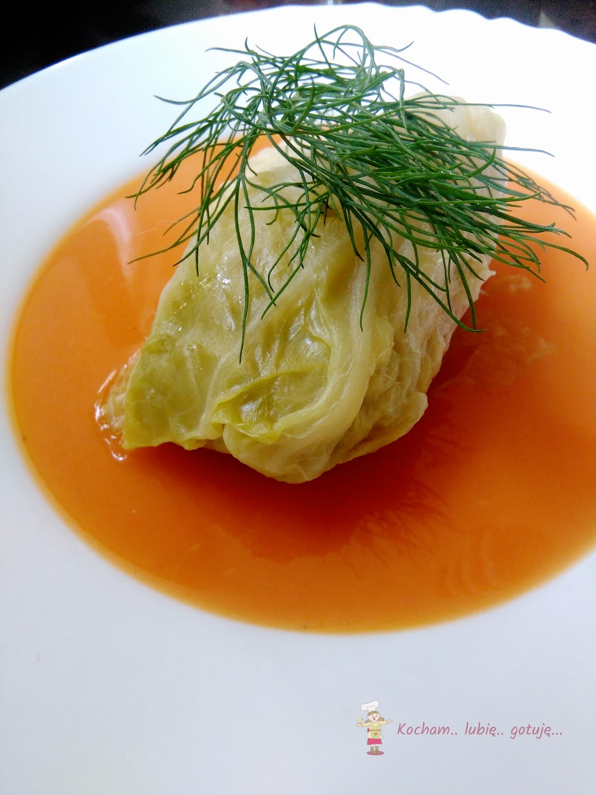 Przygotować sos: drobno pokrojoną cebulkę przesmażyć na oliwie lub oleju. Pod koniec dodać mąkę i przesmażyć. Wlać wywar z gotowania gołąbków, dodać koncentrat i przegotować. Całość zblendować i na sam koniec przyprawić cukrem, solą i pieprzem.