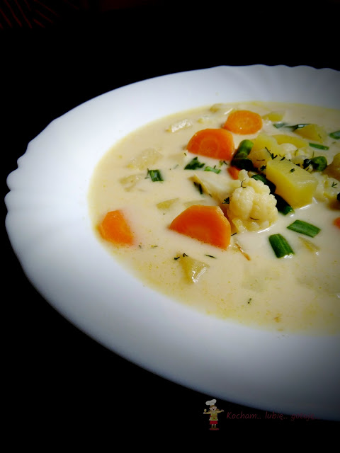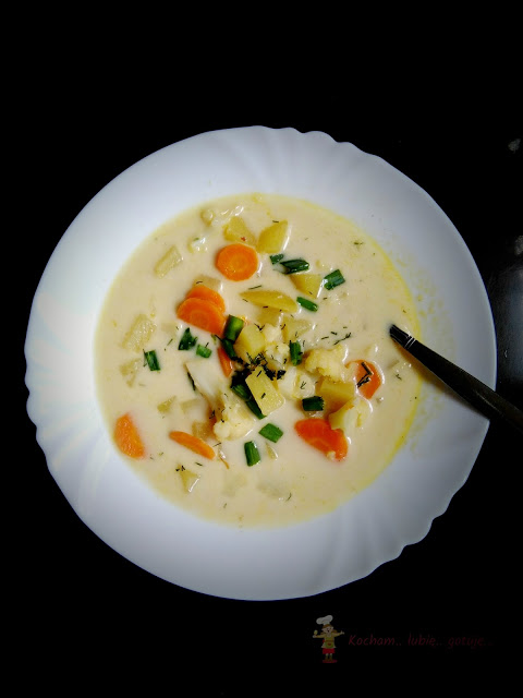 Tak jak uwielbiam sosy śmietanowe, tak zup zazwyczaj nie zabielam. Wyjątek stanowi ta kalafiorowa gdzie dodatek niewielkiej ilości delikatnej kremówki idealnie komponuje się z kalafiorem. Dla nielubiących zabielanych zup, czyt. mojego męża, kremówkę należy pominąć. Najlepsza jest z młodymi i świeżymi warzywami, lecz zimą można użyć kalafiora mrożonego i zupka nic a nic nie straci. Zupy najczęściej gotuję na bulionie drobiowo-warzywnym więc już pomijam takie warzywa jak seler czy pietruszka, niemniej jednak dodać je można w czasie gdy dodajemy marchew do zupy. Smacznego!