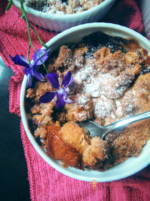 Crumble czyli owoce zapiekane pod kruszonką. Też tak macie, że z ciasta lubicie właśnie najbardziej owoce i kruszonkę? Jeśli tak to deser jest właśnie dla Was. Posiłkowałam się przepisem na crumble Nigelli Lawson z jabłkami, które już od dawna jest już na blogu. Tym razem do kruszonki dodałam wiórki kokosowe, które nadały kruszonce przyjemny kokosowy aromat i posmak a owoce najpierw lekko skarmelizowałam. Pysznie i aromatycznie wyszło :)