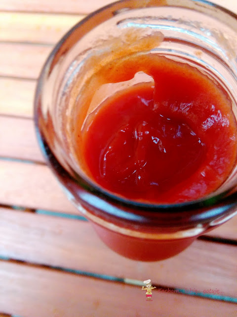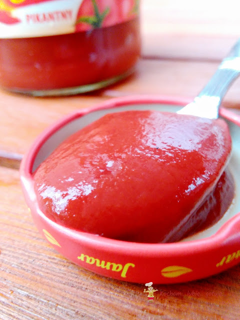 Na ten ketchup zwróciłam uwagę już po rozpakowaniu paczki. Ketchup sprzedawany jest w fantastycznych szklanych butelkach, które posiadają antypoślizgowy fragment butelki. Można chwycić mokrymi dłońmi i butelka nie wyślizgnie nam się z rąk. Poza tym buteleczki po zużyciu ketchupu idealnie nadadzą się na pasteryzowanie w nich soków lub domowych przetworów. Oprócz tego w szklanej butelce doskonale widzimy zawartość produktu. Ketchup był gęsty w sam raz, nie rozdziela się w nim woda (o tak, w niektórych ketchupach nam się to zdarzało) i jest w sam raz pikantny. Dodatkowo producent zapewnia iż jest to ketchup bez konserwantów. Fantastyczny do wszystkiego co można ketchupem posmarować ale również jako dodatek do zalew lub marynat. Ja go wykorzystałam do skrzydełek pieczonych na ryżu. Wadą ewentualnie może być to iż szklana buteleczka nie ma funkcji ułatwiającej wyciskanie, jednak długi nóż załatwia sprawę i jak dla mnie ta kwestia jest mało istotna.