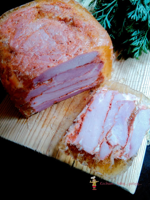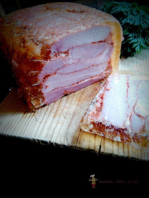 Po tym czasie mięso wyjąć, do wody dodać wszystkie wymienione składniki i przyprawy, wymieszać i wlać do zapeklowanego mięsa. Ręką dobrze wymieszać, tak aby wszystkie plastry były otoczone przyprawami. Całe mięso wyrobić lekko je ugniatając aż do rozklejenia – mięso powinno się „kleić”. Dzięki temu wędlina po zrobieniu nie będzie się rozpadać.