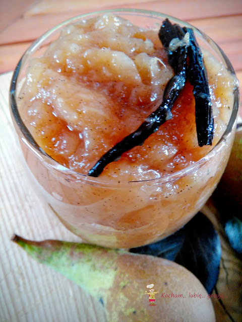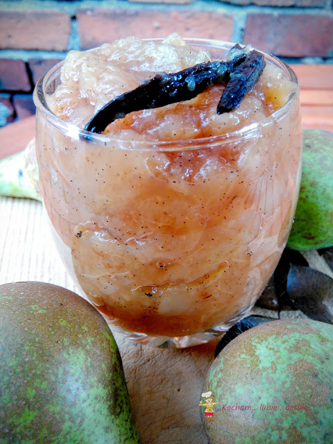 Zawsze wydawało mi się, że dżemy i konfitury z gruszek są mdłe, jałowe i bez fajerwerków. Nigdy nie robiłam bo nie widziałam w tym sensu. W tym roku nasza grusza pięknie obrodziła, większość owoców zrobiłam w syropie, troszkę ususzyłam, jedliśmy też świeże owoce na bieżąco ale podczas obierania gruszek do syropu natrafiłam na gruszki zbyt miękkie, które nie nadają się do słoików. Postanowiłam zrobić dżem na próbę. Dodałam też laskę wanilii i sok z cytryny. Posłodziłam zupełnie na końcu, tylko do smaku. Całość wyszła przepyszna i całkowicie zmieniłam zdanie o gruszkowych dżemach. Dobrze, że jeszcze owoce na drugiej, późniejszej gruszy dojrzewają :)