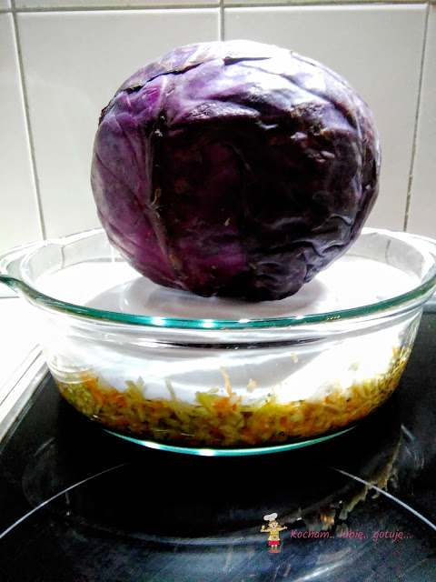 Po tym czasie kapustę przełożyć do kamionki (użyłam dużego naczynia żaroodpornego), na wierzch położyć talerz i obciążyć np. kamieniem lub naczyniem wypełnionym wodą – u mnie w roli obciążenia głowa kapusty czerwonej. Pozostawić na noc w temperaturze pokojowej.