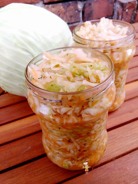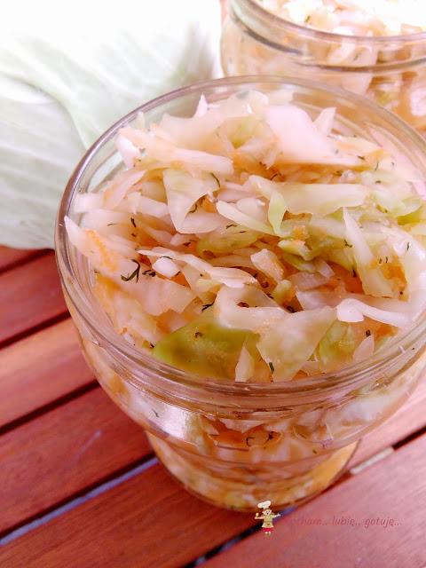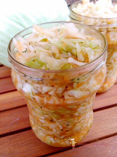 Rano kapustę przełożyć do wyparzonych słoików, na wierzch wlać pozostałą zalewę i słoiki z uchylonym wieczkiem pozostawić w temperaturze pokojowej na około 3-5 dni w zależności od stopnia ukiszenia jaki chcemy uzyskać. Codziennie trzonkiem przebić kapustę (kilka razy uderzyć). Gdy już kapusta będzie ukiszona, wstawić do lodówki (o ile zdążycie, jest bardzo smaczna).