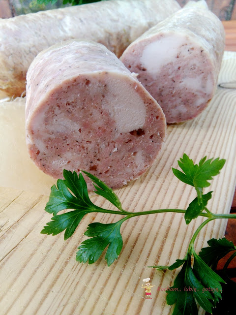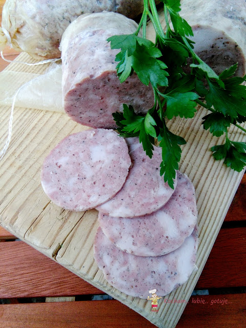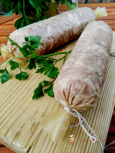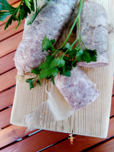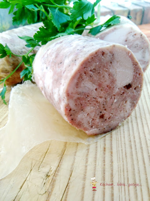Przygotować osłonkę barierową lub białkową. Do tej porcji mięsa użyłam 1,2 mb, pociętego na cztery mniejsze osłonki po 0,30 mb każda. Każdą osłonkę (w zależności od rodzaju, niektóre osłonki należy moczyć przed użyciem 15 min w zimnej wodzie, zazwyczaj jest opisane w instrukcji lub na etykiecie) zawiązać dobrze z jednej strony nicią wędliniarską, napełnić osłonkę masą mięsną i związać drugi koniec osłonki. Uformowane mielonki schować do lodówki na 8-12 h.