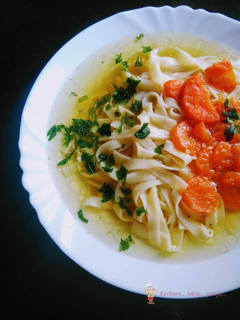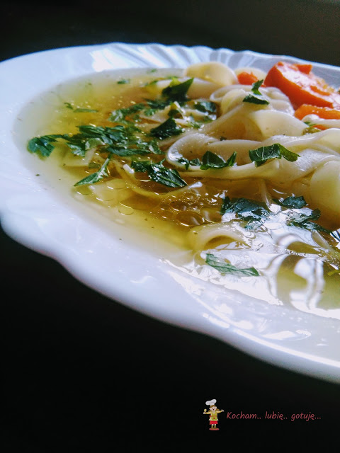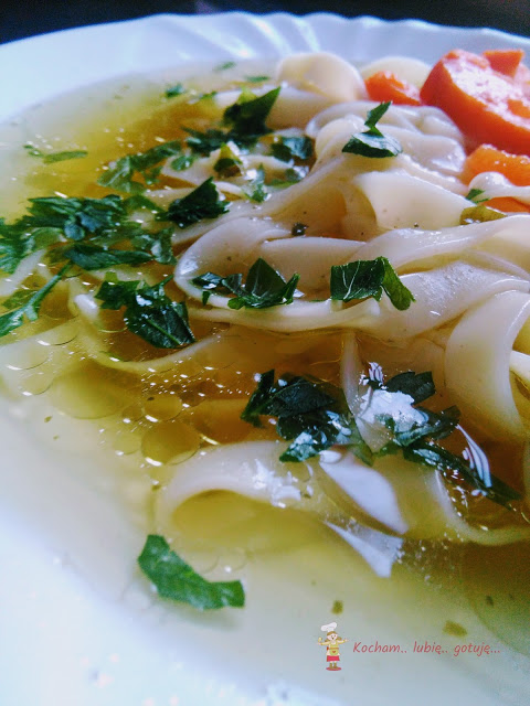 Rosół podawać z makaronem, z kluseczkami lanymi lub jak lubicie z dodatkiem mięsa z rosołu i pokrojoną marchewką.