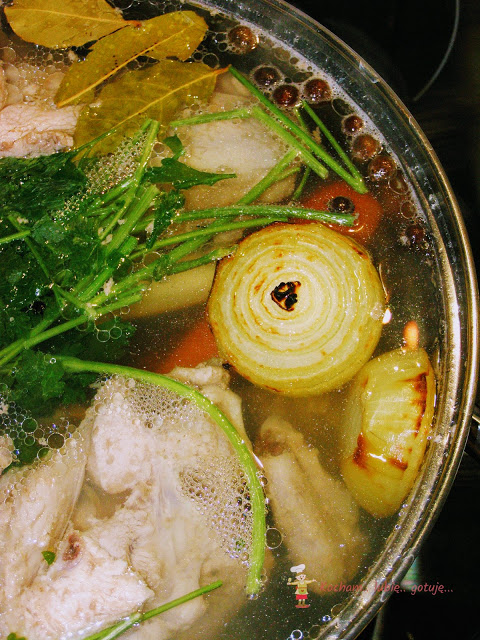 Ile domów tyle przepisów i patentów na rosół. Tak szczerze w przypadku tego rosołu nadużywam tej nazwy, ponieważ prawdziwy polski rosół to taki z różnych gatunków mięs, z drobiem, wołowiną, cielęciną. Niemniej jednak jeśli u nas w domu pojawia się rosół, to właśnie w takiej wersji i rosołem nazywać go przywykłam. Proporcje podane poniżej są bardziej orientacyjne, ponieważ zawsze trzymam się wersji iż woda ma zakrywać mięso – dzięki temu mój rosół jest bardzo aromatyczny i esencjonalny. Gotuję w garnku 5 litrowym, z około 2,5 kg drobiu. Co do mięsa to różnie – mieszam kurczaka z indykiem, gotuję na całej kurze lub czasem na ćwiartkach i dodaję szyje indycze lub skrzydło, dorzucam jeśli mam serduszka lub żołądki i może niektórych to zdziwi ale używam też kurzych łapek. Świetnie też sprawdza się dorzucenie do rosołu 1-2 kaczych skrzydełek lub korpusu. Niewątpliwie bardzo ważnym elementem dla mnie jest dodatek opalonej cebulki. Kiedyś gdy miałam kuchenkę gazową to nie było problemu opalić cebulkę na palniku. Problem pojawił się z chwilą pojawienia indukcji – ale też mam sposób, opalam palnikiem gazowym ręcznym (takim do creme brulee), w piekarniku pod grillem albo na malutkiej patelence. Warzywa prawie tradycyjnie: marchew, seler, pietruszka i por. Nie dodaję kapusty ale za to zielone liście selera i natkę pietruszki, które mam przez cały rok – świeże lub zimą z zapasów zamrażalnika. Często też dodaję same łodyżki natki pietruszki, które mam zamrożone. Nic się nie zmarnuje. I chyba najważniejsze – rosołek delikatnie pyrka w 5 litrowym garnku 2 godzinki. Pyszny sam w sobie z tymi wszystkimi oczkami i jako baza do wszelkich zup.