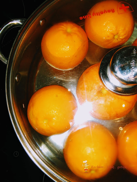 Zlać całą wodę z pomarańczy, pomarańcze opłukać, ponownie umieścić w garnku, zalać czystą wodą i całość zagotować. Gotować 30 min od momentu zagotowania na średniej mocy palnika. Ostudzić (najlepiej w zlewie z zimną wodą) i ponownie całość (pomarańcze razem z wodą, w której się gotowały) odstawić w chłodne miejsce (np. do lodówki) na 24 h.