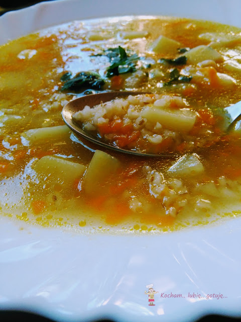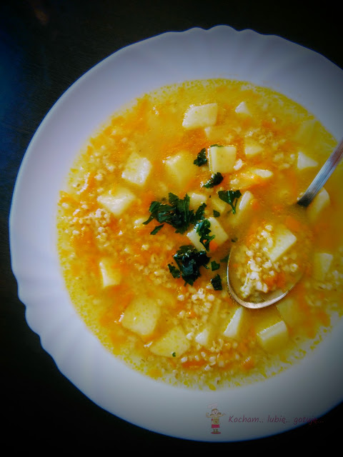 Lubię zupy, nie tylko za smak ale przede wszystkim za to, że ich większość mogę przygotować wieczorem dnia poprzedniego a kolejnego w odpowiedniej porze tylko podgrzać i od razu zasiadać do stołu. Za zupami gotowanymi na samych warzywach zbytnio nie przepadamy więc na naszym stole dość często gości rosół aby jego nadmiar skrzętnie mrozić w litrowych porcjach – idealnych na późniejsze przygotowanie wszelkich zup dla naszej trójki. Tym razem krupnik, pyszny i rozgrzewający. Polecam :)