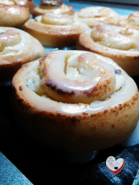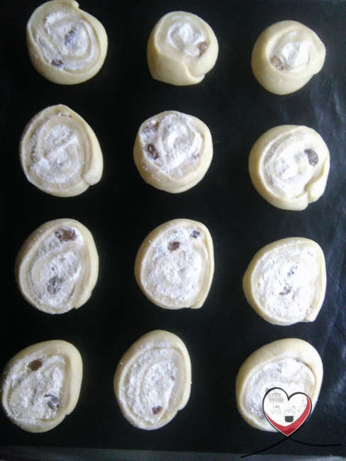 Wyrobione ciasto przełożyć na stolnicę, krótko zagnieść kilka razy aby ciasto odgazować. Ciasto podzielić na dwie części, każdą część rozwałkować na stolnicy delikatnie podsypując mąką na prostokąt. Na każdej części rozsmarować połowę farszu serowego i zwinąć w rulon jak roladę. Pociąć na kawałki (u mnie z jednej części 12 sztuk).