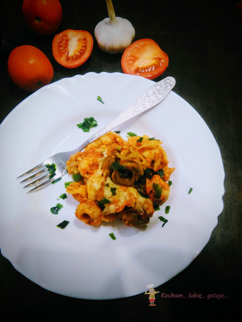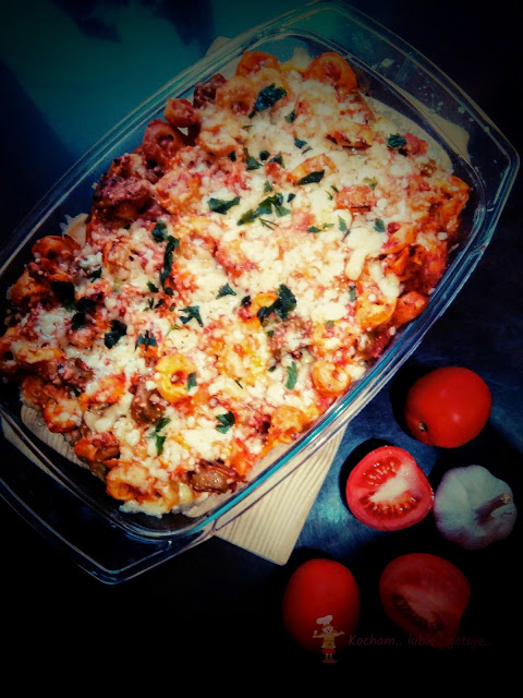 Do gotowego sosu dodać ugotowane i odcedzone pierożki tortellini, wymieszać i przełożyć do formy lub naczynia żaroodpornego wcześniej wysmarowanego oliwą. Wyrównać i całość posypać serem. Wstawić do piekarnika nagrzanego do 200oC i zapiekać około 10-15 min aż ser się rozpuści i przyrumieni.