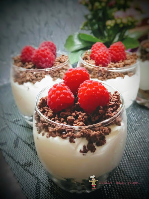 Na spód szklaneczek lub pucharków wyłożyć pokruszone herbatniki, wyłożyć maliny, nałożyć krem, posypać tartą czekoladą i ozdobić malinami. Warstwy można dostosować do swoich upodobań. Schłodzić w lodówce.