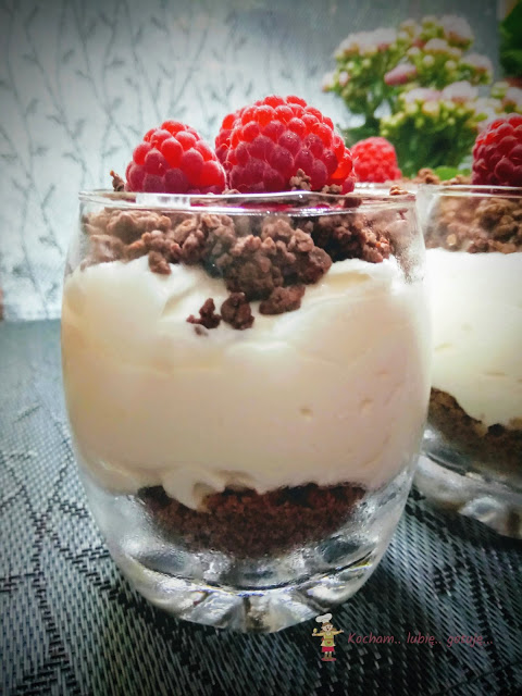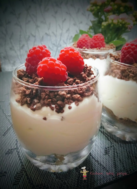 W prostocie siła. Pyszny deser do zrobienia w mgnieniu oka, idealny z każdymi owocami i ciasteczkami. W tym przypadku użyłam ciasteczek korzennych – cynamonowa nuta świetnie współgrała z malinami. W wersji lżejszej zamiast kremu warto użyć jogurtu – wyjdzie pyszny i zdrowy deser :) W obu przypadkach polecam serdecznie.
