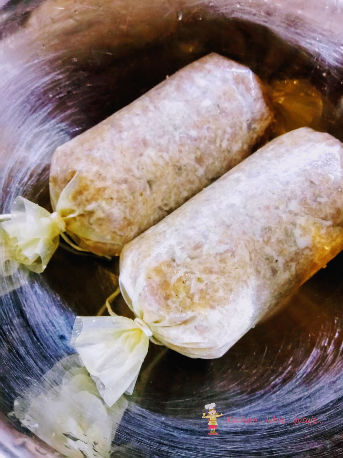 Kiełbasy umieścić w garnku i zalać zimną wodą, ustawić na palniku na największej mocy. Gdy woda osiągnie temperaturę 75-80oC (lekko będzie „pyrkać”) zmniejszyć moc palnika i parzyć aż wyrób w środku osiągnie 68oC, ciągle utrzymując podaną stałą temperaturę wody 75-80oC. Po tym czasie kiełbasy wyciągnąć z garnka i studzić w zimnej wodzie 10-15 min, następnie przełożyć do lodówki na minimum 12 h.