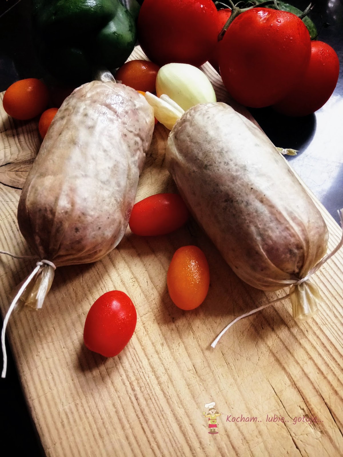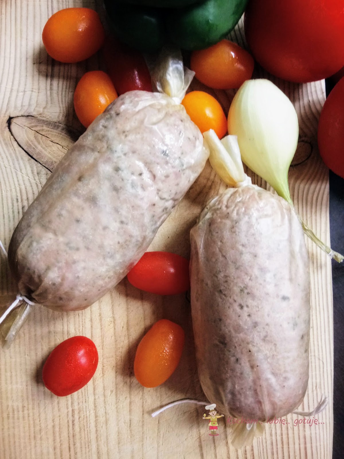 Przygotować osłonki, zgodnie z zaleceniem producenta niektóre trzeba moczyć (info na opakowaniu). Zawiązać jeden koniec osłonki, napełnić ściśle mięsem tak aby nie było pęcherzyków powietrza, zawiązać drugi koniec osłonki, kiełbaski schować do lodówki na 8-12 h.