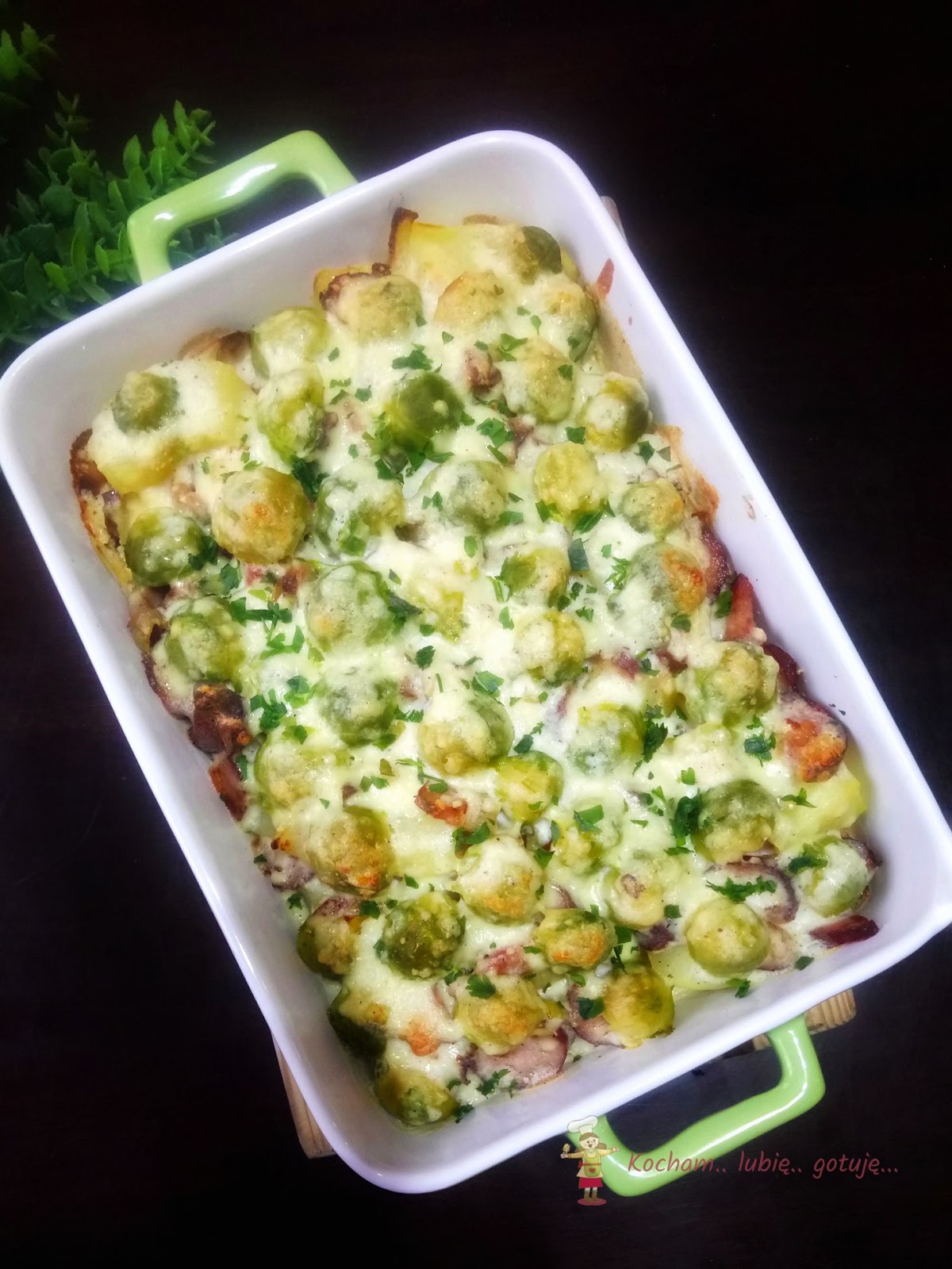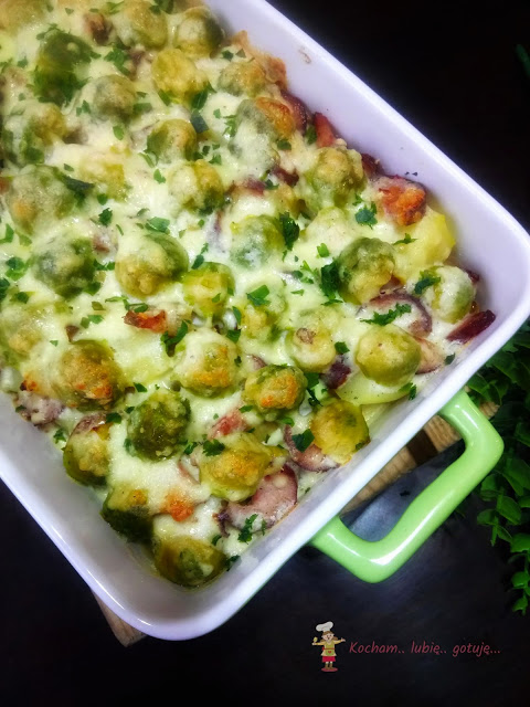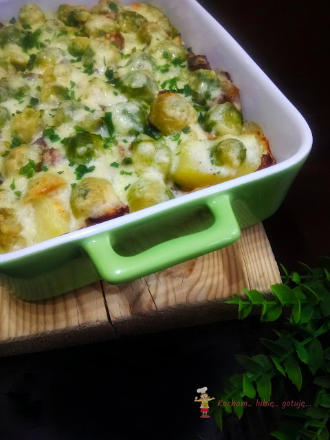 Naczynie do zapiekania wysmarować olejem lub masłem, wyłożyć ugotowane ziemniaki pocięte na mniejsze kawałki. Na to wyłożyć kiełbaskę z cebulą oraz brukselki. Całość zalać sosem i posypać troszkę startym żółtym serem. Całość wstawić do piekarnika rozgrzanego do 180oC i zapiekać 30 min.