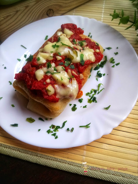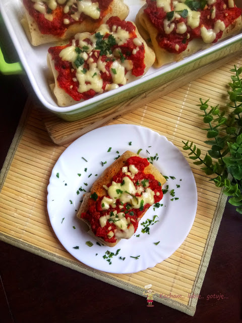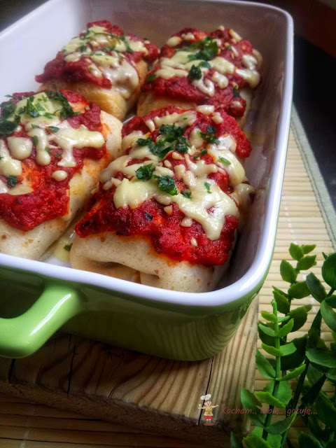 Przygotowanie naleśników: na każdy naleśnik nakładać porcję farszu, następnie posypać 3 łyżkami sera, zwinąć w rulon lub jak krokieta podwijając brzegi. Każdego naleśnika ułożyć na blasze lub w formie do zapiekania wysmarowanej oliwą, na wierzch rozłożyć sos pomidorowy, posypać serem żółtym i wstawić do piekarnika nagrzanego do temperatury 180oC, zapiekać 20 min.