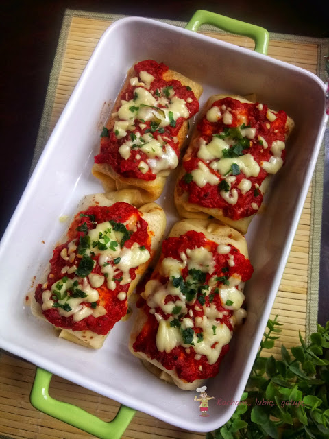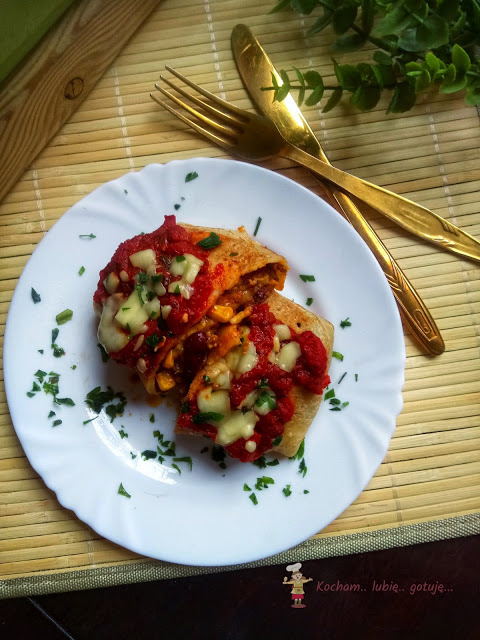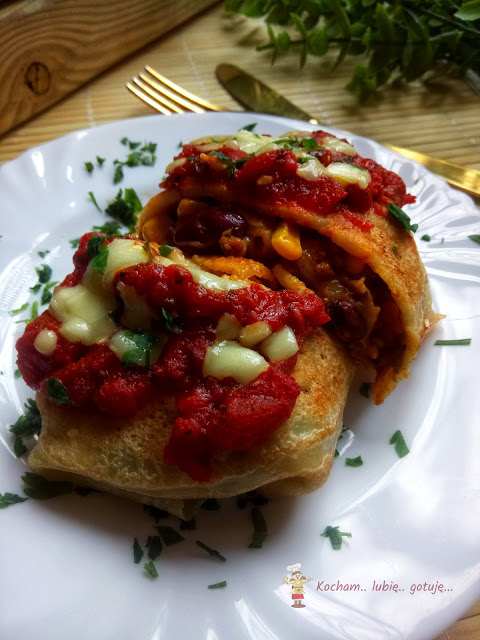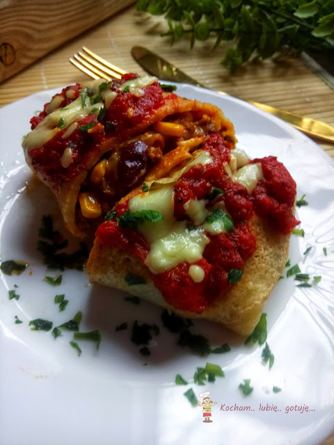 Wspaniałe zapiekane naleśniki z bardzo aromatycznym farszem, przygotowanym na sposób meksykański. Zapiekane pod pysznym sosem pomidorowym i serem. Przepis pochodzi ze strony Kwestia Smaku i jest warty polecenia dalej.
