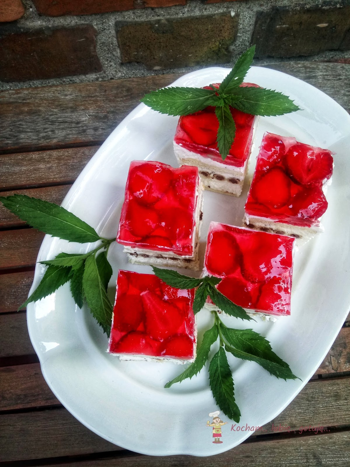 Na cieście rozłożyć umyte, odszypułkowane i pokrojone truskawki (połówki, grube plastry lub w nawet w całości) i zalać tężejącą galaretką. Ciasto wstawić na kilka godzin do lodówki aby herbatniki i rurki zmiękły, najlepiej na całą noc.