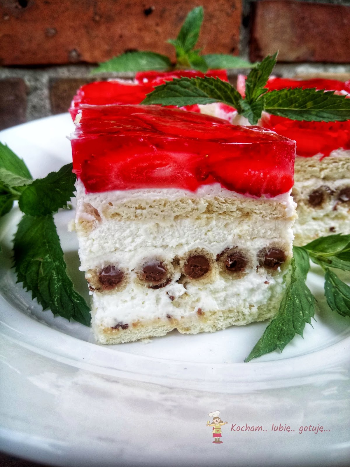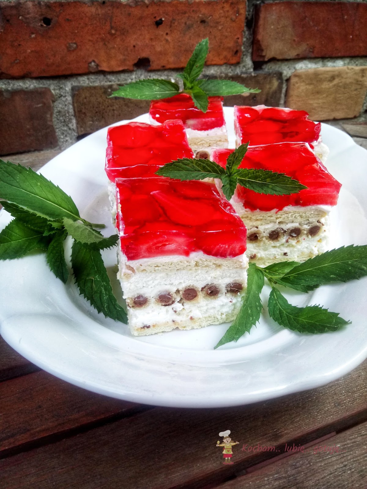 Uwielbiamy rurki waflowe z nadzieniem. Moja lista gotowych słodyczy jest bardzo krótka i rzadko można u nas spotkać coś, co nie jest domowym wyrobem lecz takie rurki od czasu do czasu cieszą się powodzeniem. Kiedy ze wszelkich stron kusili ciastem bez pieczenia z użyciem rurek waflowych od razu wiedziałam, że też je przygotuje. U mnie w wersji z truskawkami i galaretką, masą kremową przełamaną sokiem z cytryny. Ciasto wychodzi rewelacyjne, po stężeniu i kiedy rurki zmiękną pięknie się kroi i ładnie prezentuje na stole. Korzystałam z przepisu