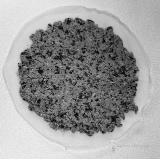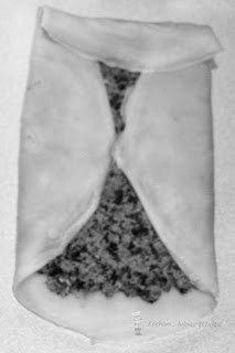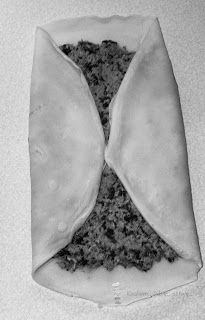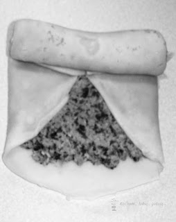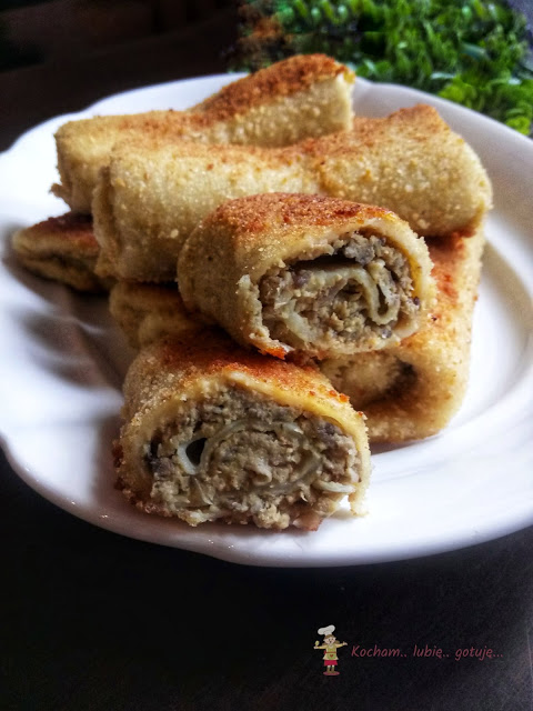 Naleśnika położyć na desce lub talerzu, wyłożyć część farszu. Rozsmarować po całości, zostawiając około 1 cm odstęp od brzegu naleśnika. Złożyć krokieta. Poniżej zdjęcia, jak ja składam. Postąpić tak samo z resztą naleśników.