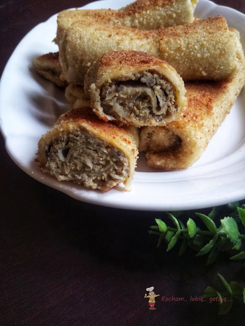Po tym czasie smażyć cienkie naleśniki na dobrze rozgrzanej i lekko natłuszczonej patelni. Ja do smażenia naleśników używam buteleczki ze sprayem, w której mam olej i tylko pryskam na samym początku. Niektórzy do krokietów smażą naleśniki tylko z jednej strony – ja smażę tradycyjnie z dwóch stron na złoty kolor.