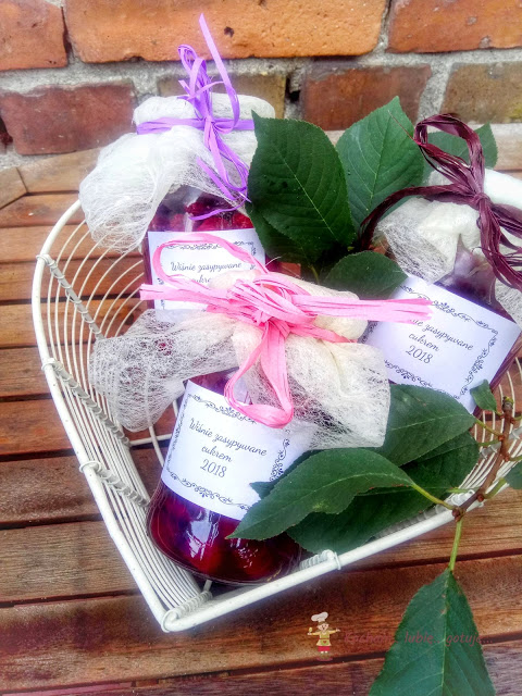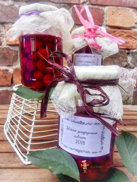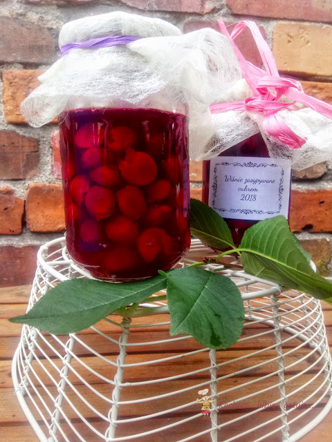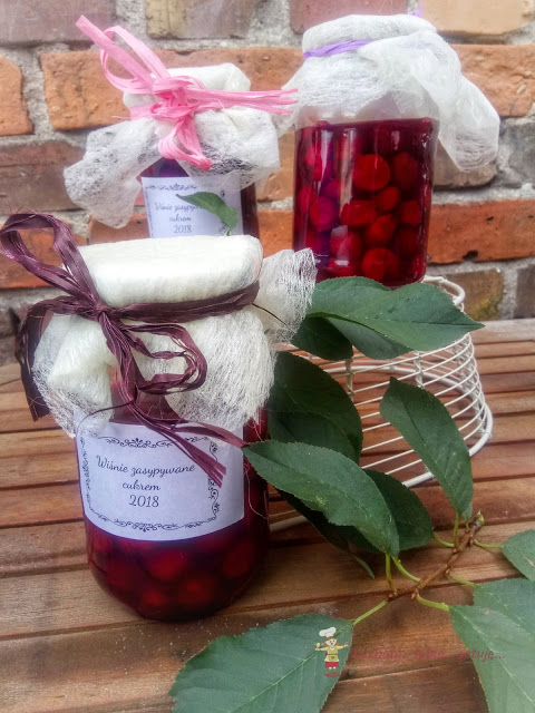 Co roku przetwarzam masę wiśni. W tym roku obrodziły bardzo, część przetwarzam na bieżąco, prawie 30 kg owoców rozdałam rodzinie a jeszcze drugie drzewo czeka na zbiory, które codzienne burze i deszcze skutecznie od tygodnia utrudniają. Oprócz różnych konfitur, dżemów i frużelin robię wiśnie w zalewie oraz słoiki na zimę, chyba najprostsze ze wszystkich, gdzie wiśnie tylko zasypuje się cukrem i pasteryzuje. Takie wiśnie pamiętam z dzieciństwa, gdzie zawsze z mamą w ten sposób przygotowywałyśmy zapasy na zimę. Podczas pasteryzacji wiśnie puszczają sok i otrzymujemy pyszne wiśnie w soku, idealne na kompot, do ciasta, zupy owocowej czy domowego kisielu. Polecam szczerze :)