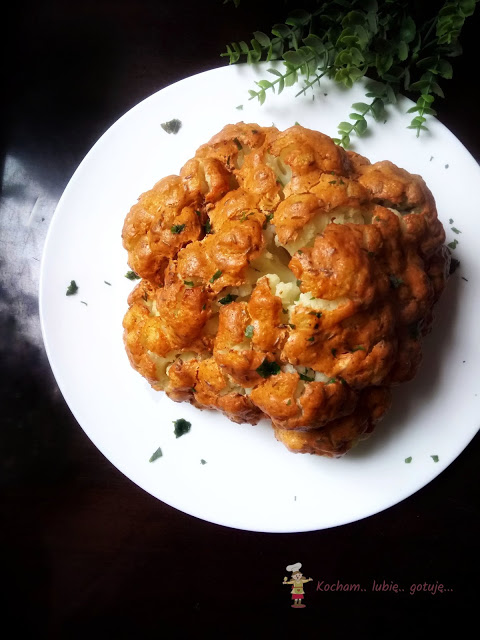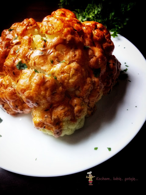 Blachę wstawić do piekarnika nagrzanego do 180oC i piec kalafior 40 min. Pierwsze 30 min piekłam z termoobiegiem, na ostatnie 10 min włączyłam dodatkowo grzałkę górną aby kalafior się ładnie przyrumienił.