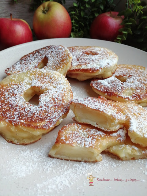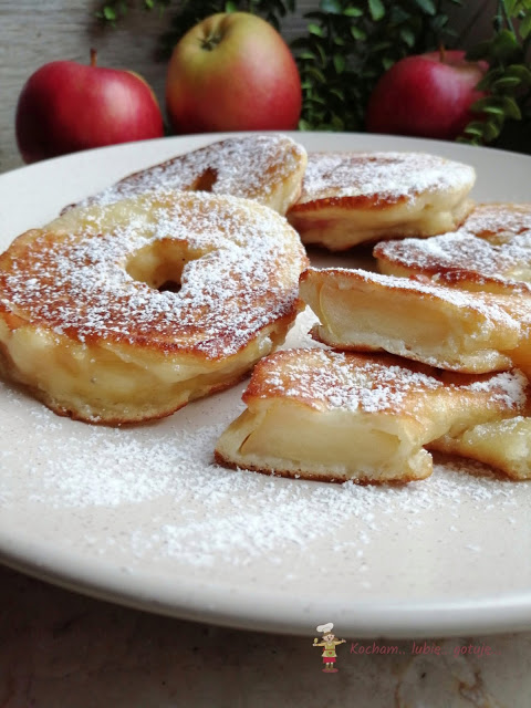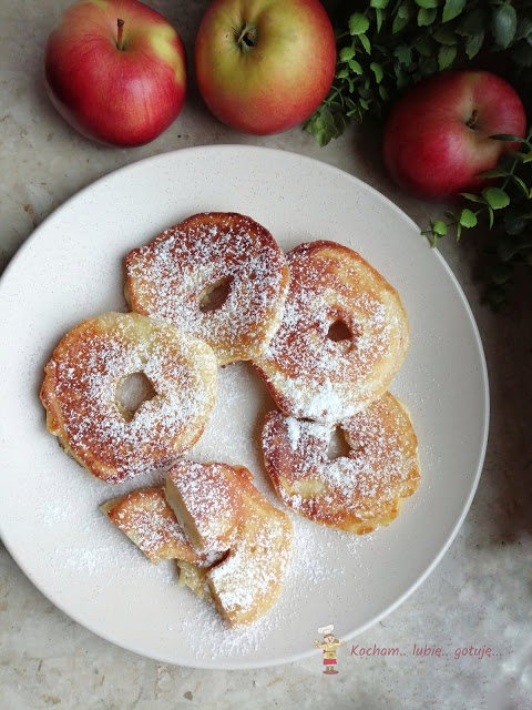 Plastry jabłka moczyć w cieście drożdżowym i smażyć na oleju na rumiano. Po usmażeniu odkładać na ręcznik papierowy aby odsączyć resztę tłuszczu, podawać posypane cukrem pudrem lub jak lubicie.