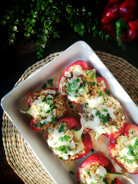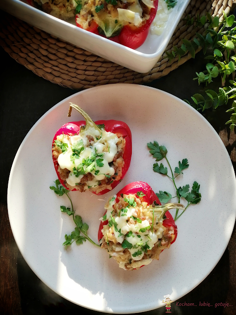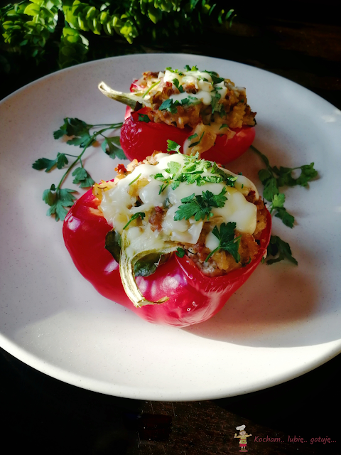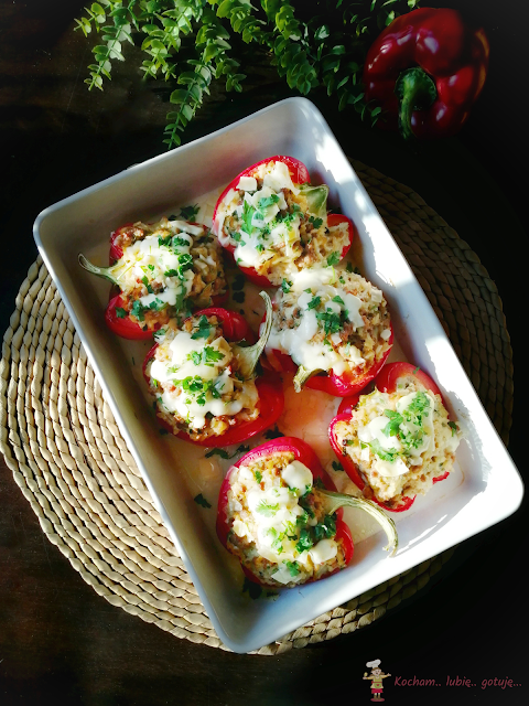 Papryki ułożyć w naczyniu żaroodpornym wysmarowanym oliwą, wlać pół szklanki wody i wstawić do piekarnika nagrzanego do 200oC, piec 35 min. Po tym czasie papryki posypać tartym serem żółtym lub położyć plasterek sera żółtego i zapiec kilka minut do momentu aż ser się rozpuści. Posypać posiekaną natką pietruszki.