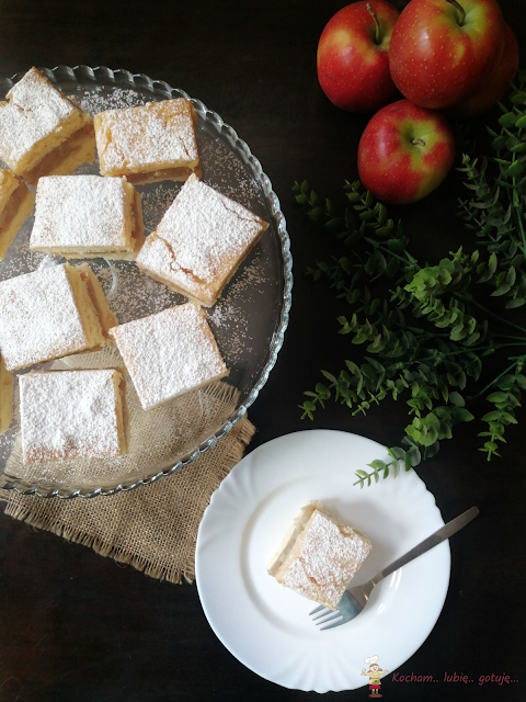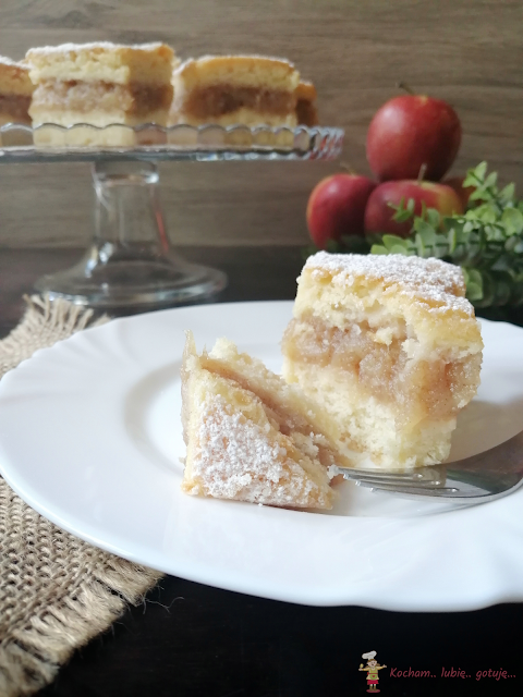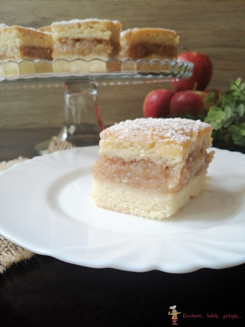 Formę do pieczenia wyłożyć papierem do pieczenia i na dno wlać połowę ciasta. Ciasto wstawić do piekarnika nagrzanego do temperatury 170oC (termoobieg) i piec 15 minut aż wierzch będzie rumiany. Na podpieczone ciasto wyłożyć delikatnie ostudzoną masę jabłkową, następnie równomiernie rozłożyć drugą połowę ciasta. Ciasto ponownie wstawić do piekarnika i piec 30-35 minut. Po ostudzeniu ciasto posypać cukrem pudrem.